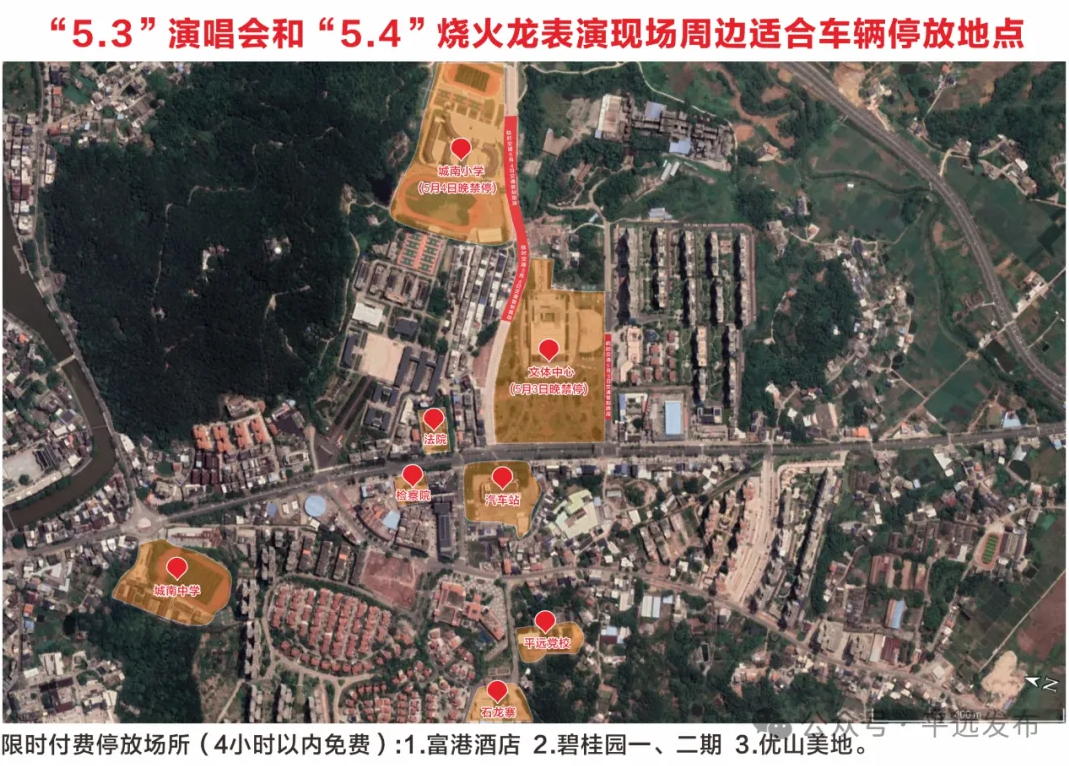 五一假期,平远县将于5月3日举行“醉美橙乡·多彩平远”经典金曲群星演唱会,于5月4日举行“烧火龙”表演。为保障活动现场及周边道路交通有序、安全、畅通,根据《中华人民共和国道路交通安全法》等法律法规规定,决定自5月3日15时起至演唱会结束、5月4日15时起至“烧火龙”表演结束对文体中心及城南小学周边道路实施临时交通管制措施。现将相关情况通告如下: