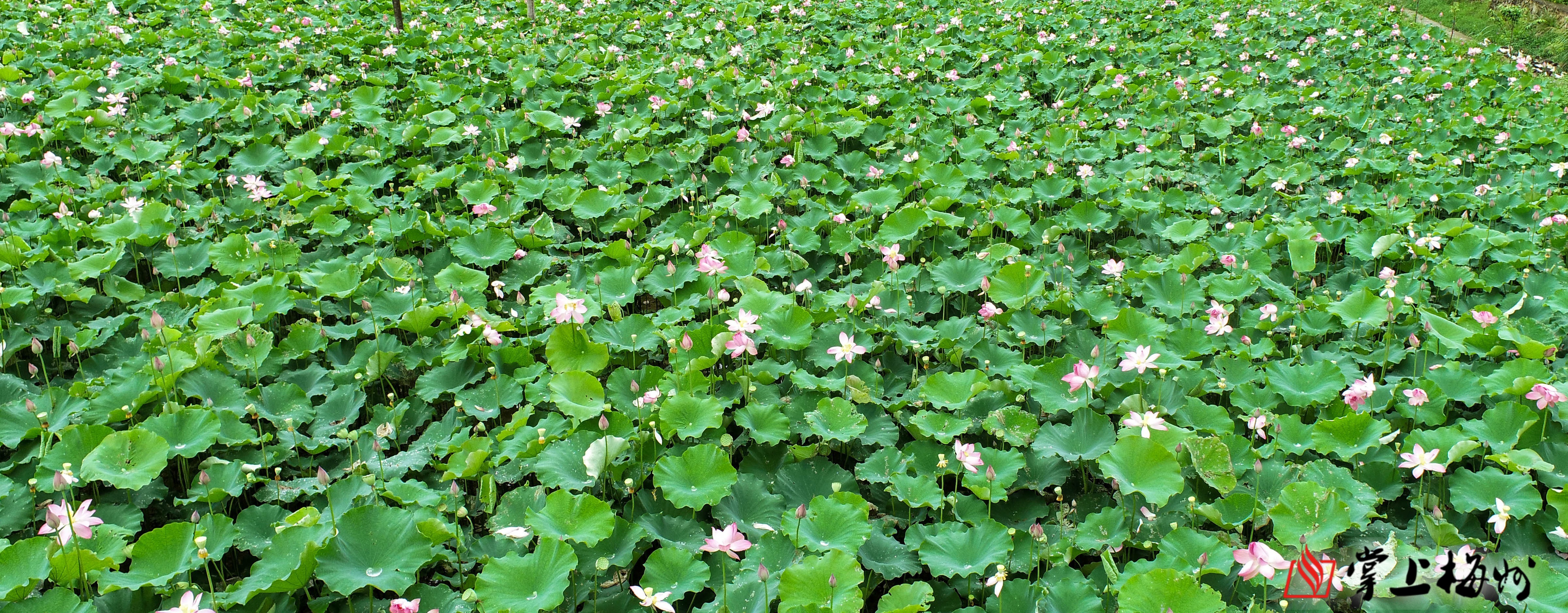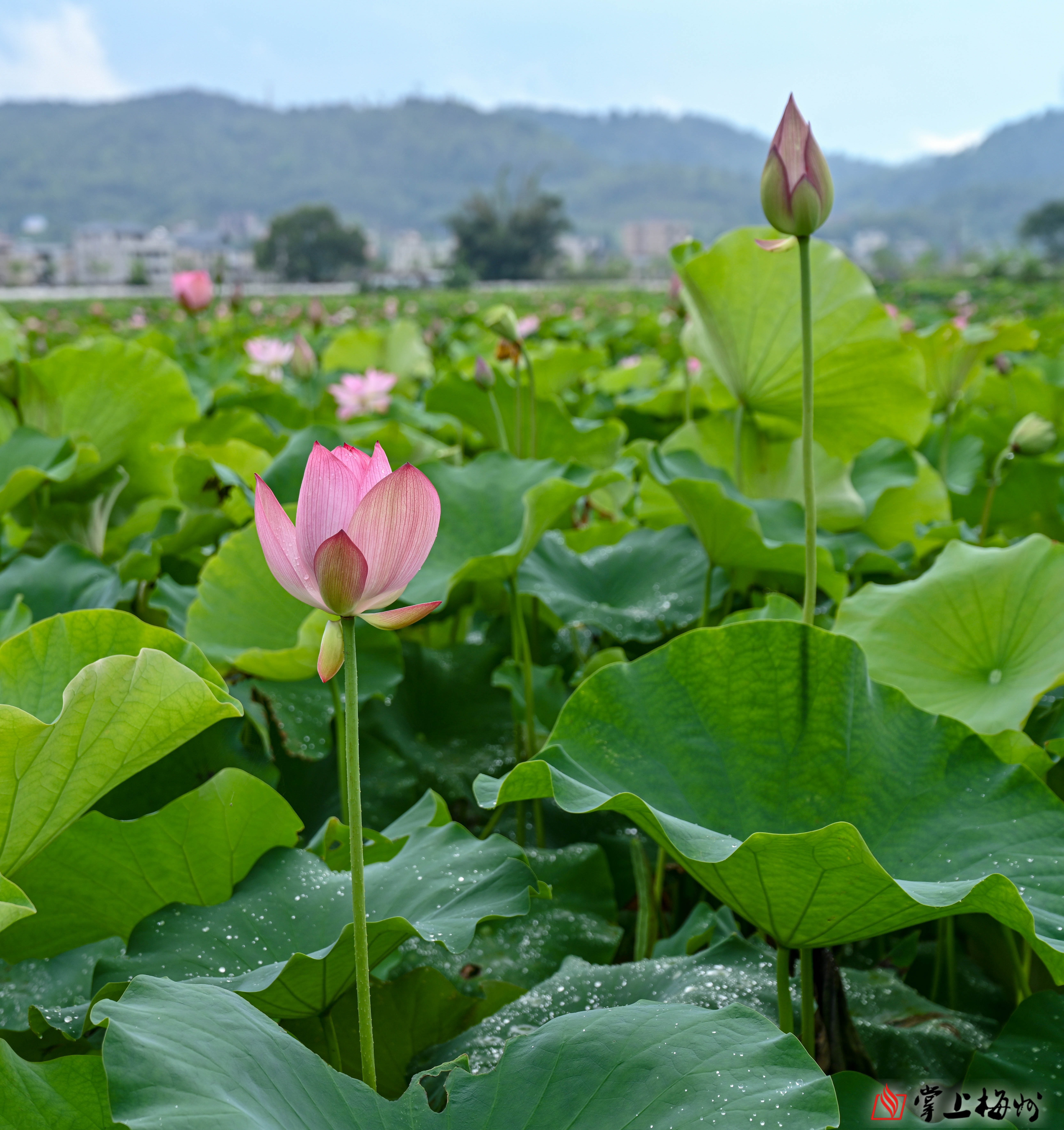 在大柘镇杞园村车上村民小组,100余亩荷塘翠叶翻涌成浪,粉白花朵星罗棋布。粉白相间的荷花或含苞待放、或亭亭玉立,与远处青山、近处稻田相映成趣。