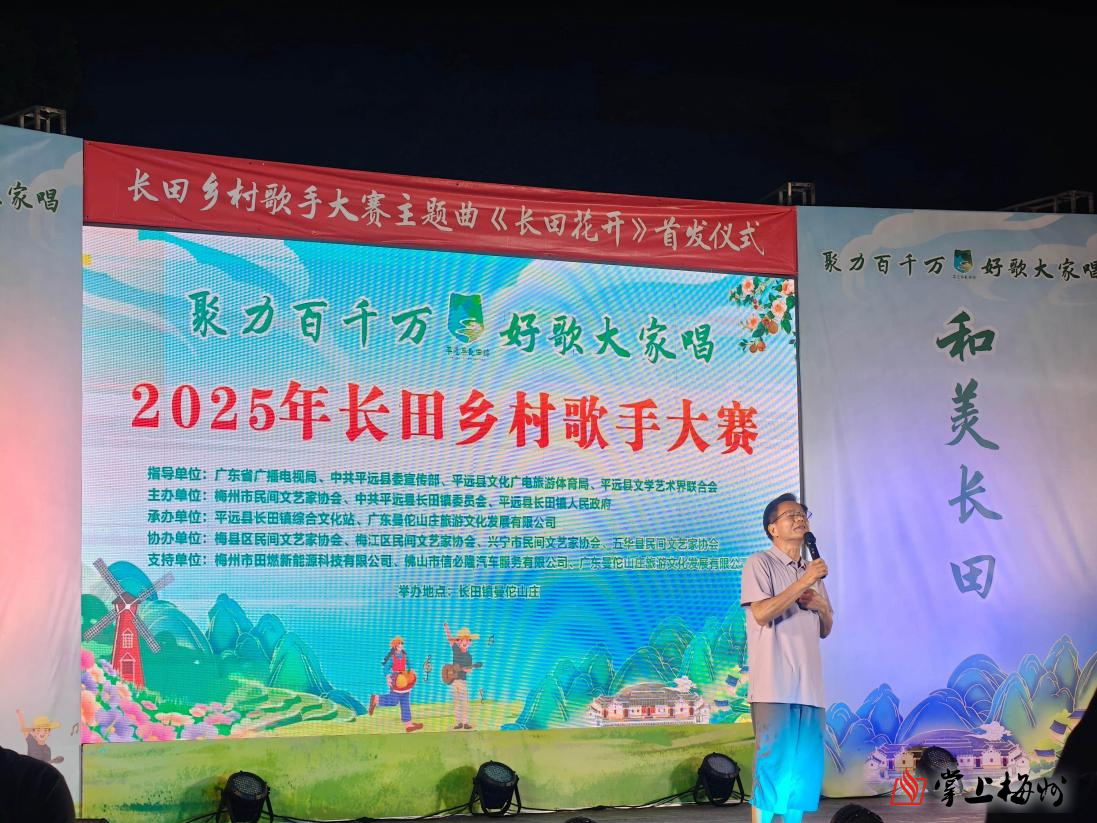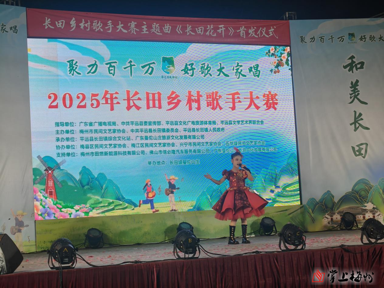 活动在主题曲《长田花开》的首发仪式中拉开序幕。仪式上,梅州市民间文艺家协会主席陈的明、著名词曲作家王巧忠两位老师介绍了主题曲的创作背景及艺术构思,强调作品在传承客家山歌文化、展现乡村新风貌方面的积极意义。原梅州文化旅游特色区管委会副主任谢小康同志、原梅州市文联四级调研员马苑华同志表示:“《长田花开》歌词纯朴甜美,勾勒出长田美丽乡村画面;旋律悠扬动听,奏响了人们向往幸福生活的华丽乐章;乡村歌手大赛少儿组的圆满举办,也必将助力‘百千万工程’高质量发展。”随后,全体参赛选手与现场观众共同演唱《长田花开》,形成台上台下联动的热烈氛围,充分展现了群众文化活动的广泛参与性。
