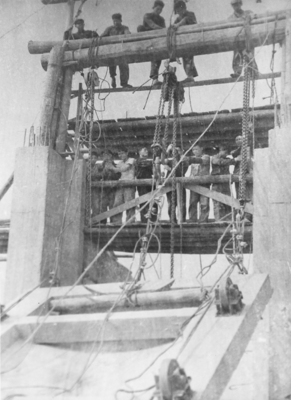 1972年,黄田水库土法吊装闸门劳动场面