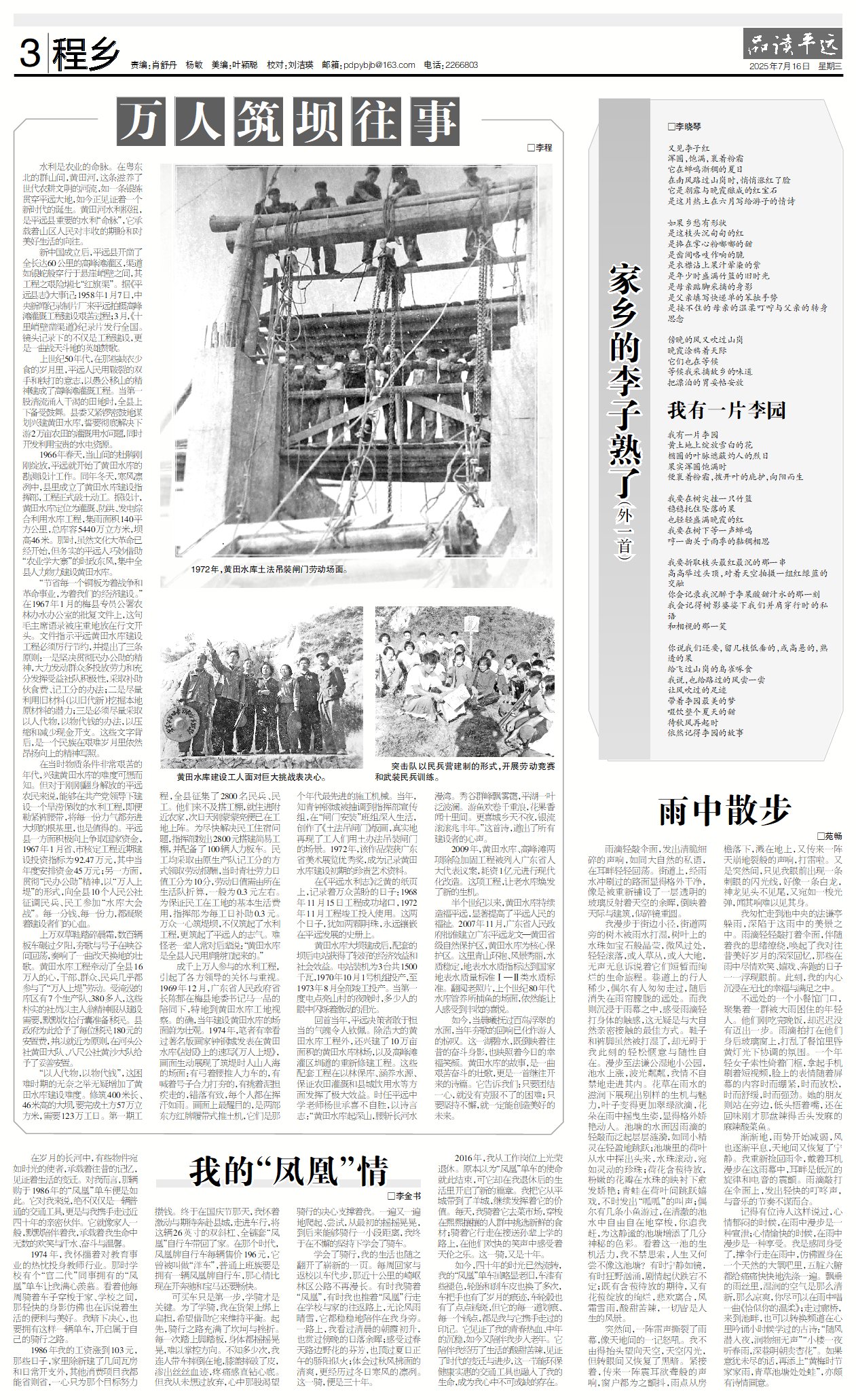 回首当年,平远决策者敢于担当的气魄令人钦佩。除浩大的黄田水库工程外,还兴建了10万亩面积的黄田水库林场,以及高峰滩灌区圳道的重新修建工程。这些配套工程在以林保库、涵养水源、保证农田灌溉和县城饮用水等方面发挥了极大效益。时任平远中学老师杨世承喜不自胜,以诗言志:“黄田水库起深山,腰斩长河水漫湾。秀谷群峰飘雾霭,平湖一叶泛波澜。游鱼欢卷千重浪,花果香闻十里间。更喜城乡天不夜,银流滚滚兆丰年。”这首诗,道出了所有建设者的心声。