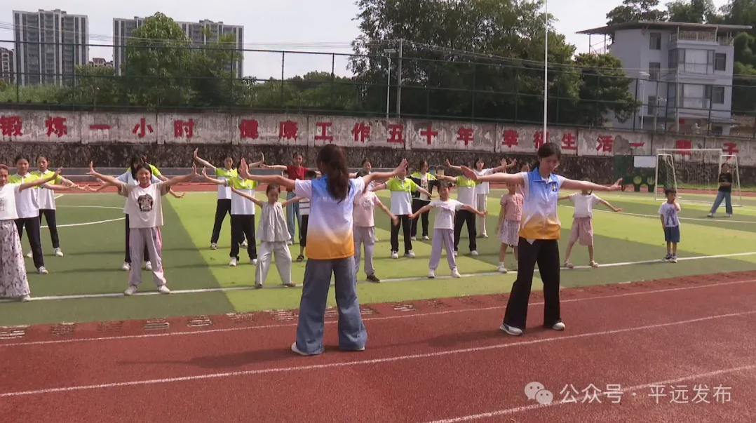 在大柘中心小学的操场上,一场别开生面的“八段锦”教学正在进行。青年志愿者们带领着同学们在动静相兼的节奏中缓慢起势、抬手、拉伸,一招一式有模有样,现场氛围轻松而热烈。