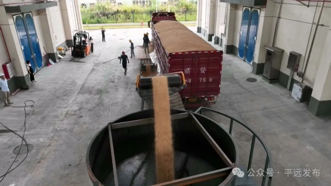 在位于平远高新区的平远新供销天润粮油有限公司,满载金灿灿稻谷的车辆有序排队,工作人员认真地逐一对每辆车上的稻谷进行扦样抽检,并安排卸粮入库,现场各项工序繁忙而有序。