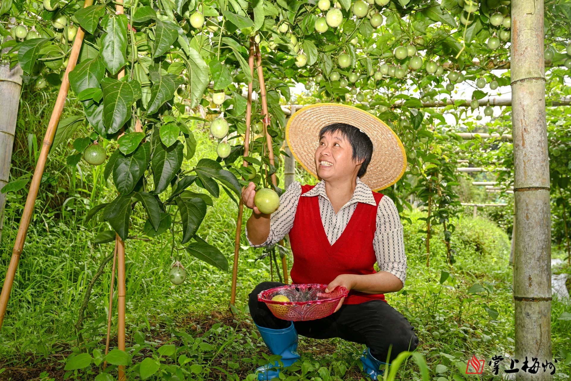 走进仁居镇南龙村的百香果园,放眼望去绿意盎然,绿油油的藤蔓爬满棚架,一个个百香果挂满枝头,微风轻拂,空气中弥漫着一股淡淡的果香味,令人垂涎欲滴。果园内,村民在藤蔓间来回穿梭,有条不紊地采摘成熟饱满的黄金果。“这是钦蜜9号黄金百香果,皮薄、果酱饱满、果味香浓,可从6月底采摘至11月。”果园负责人介绍,刚采摘的百香果呈青绿色,需用纸包裹锁住水分,经两三天自然转化,外皮变黄时口感最佳。小小百香果,如今已成为果农增收的“黄金果”,更为乡村振兴注入强劲动力。