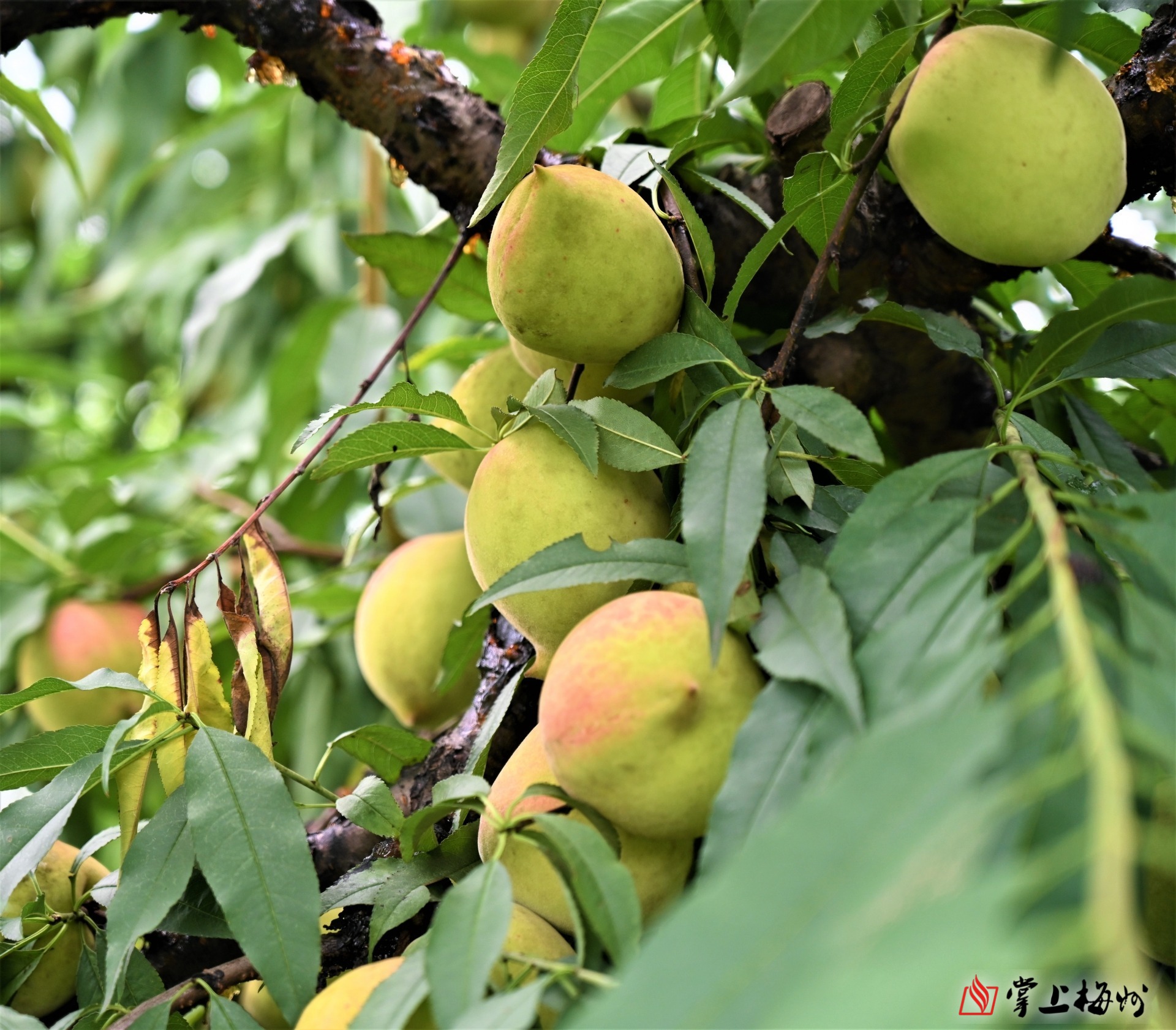 在八尺镇黄沙村,鹰嘴桃也迎来了丰收。鹰嘴桃因桃尖像鹰嘴而得名,以肉质爽脆、果汁多、甜味浓而深受广大消费者喜爱。桃树翠绿,果实累累压弯枝头。微风轻拂,桃香弥漫。果园里传来农民欢快的笑声,他们穿梭在桃林间,正采摘着成熟的桃果,也有三两游客结队前来,左瞧右看挑选心仪的桃果,迫不及待地想尝尝鲜甜。