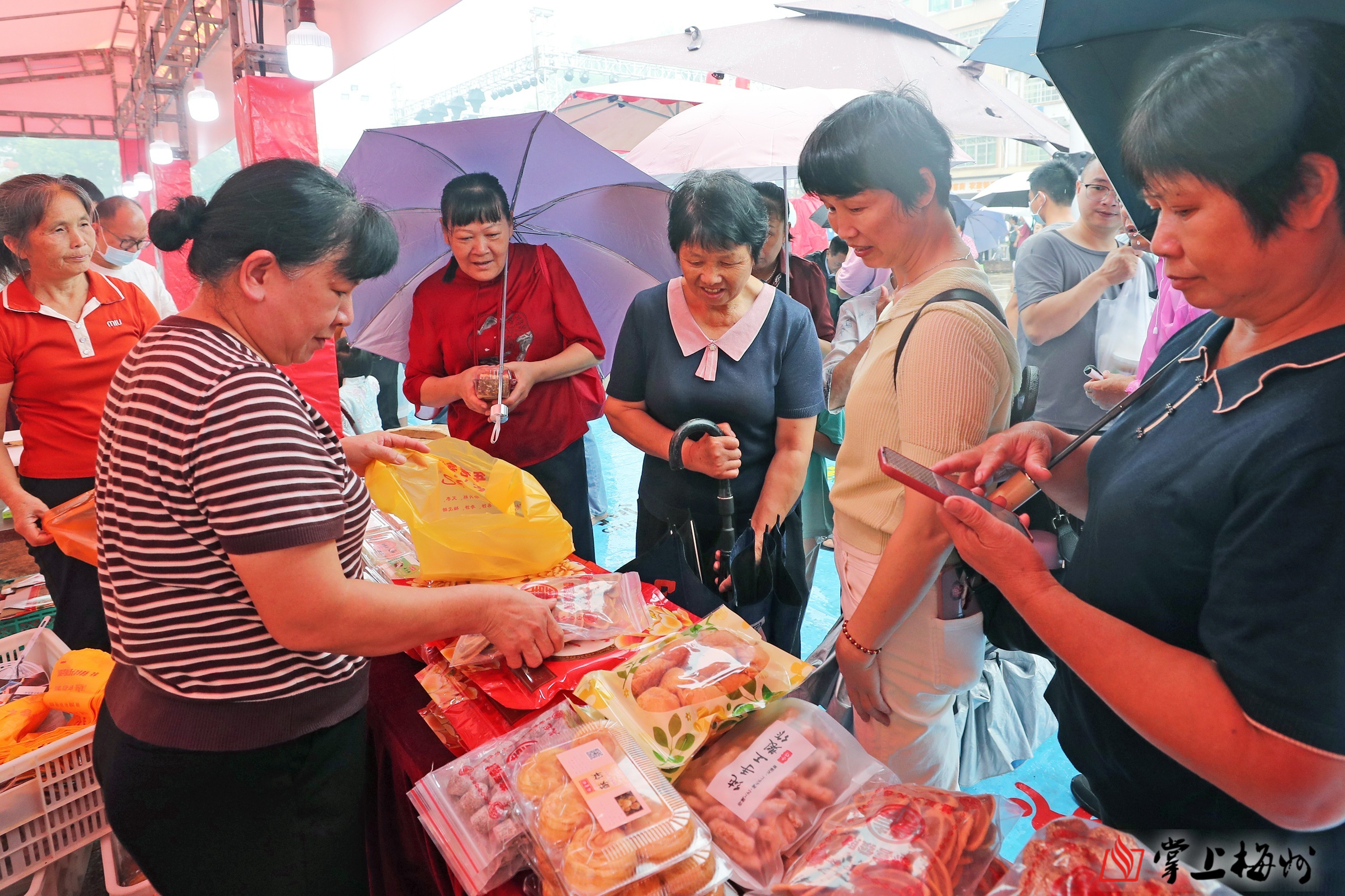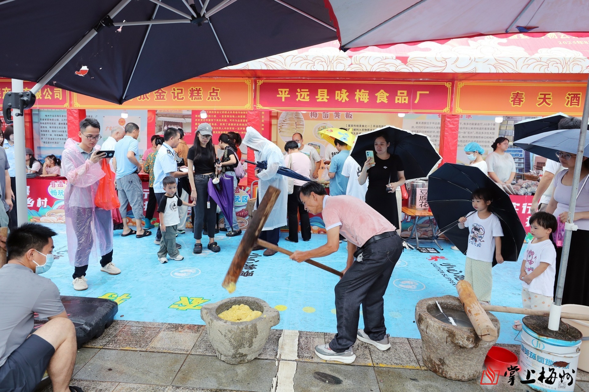为放大促消费效应,差干镇政府广场同步变身热闹的文旅市集。上午9时30分,虽有小雨,但16个特色展位前人头攒动。“农特优品区”汇聚平远及福建下坝乡、民主乡、江西项山乡特产;“非遗美食区”飘散着仙人粄、糍粑黄粄及清补凉的香气;“非遗展示区”的石正煲钵、平远木雕技艺引人驻足;“非遗畅玩区”则让游客亲身体验打黄粄、打糍粑和客家竹编制作的乐趣,有效激活本地消费。