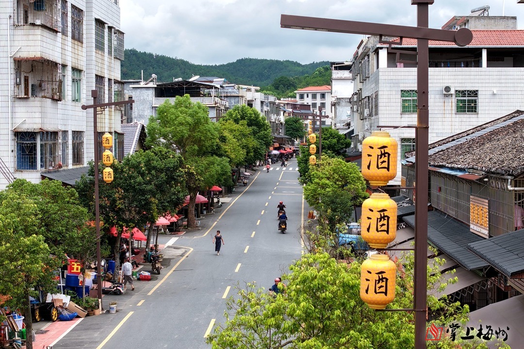 平远八尺圩镇沿街竖立的传统灯笼式路灯,以“酒”字点睛,蜿蜒延伸。