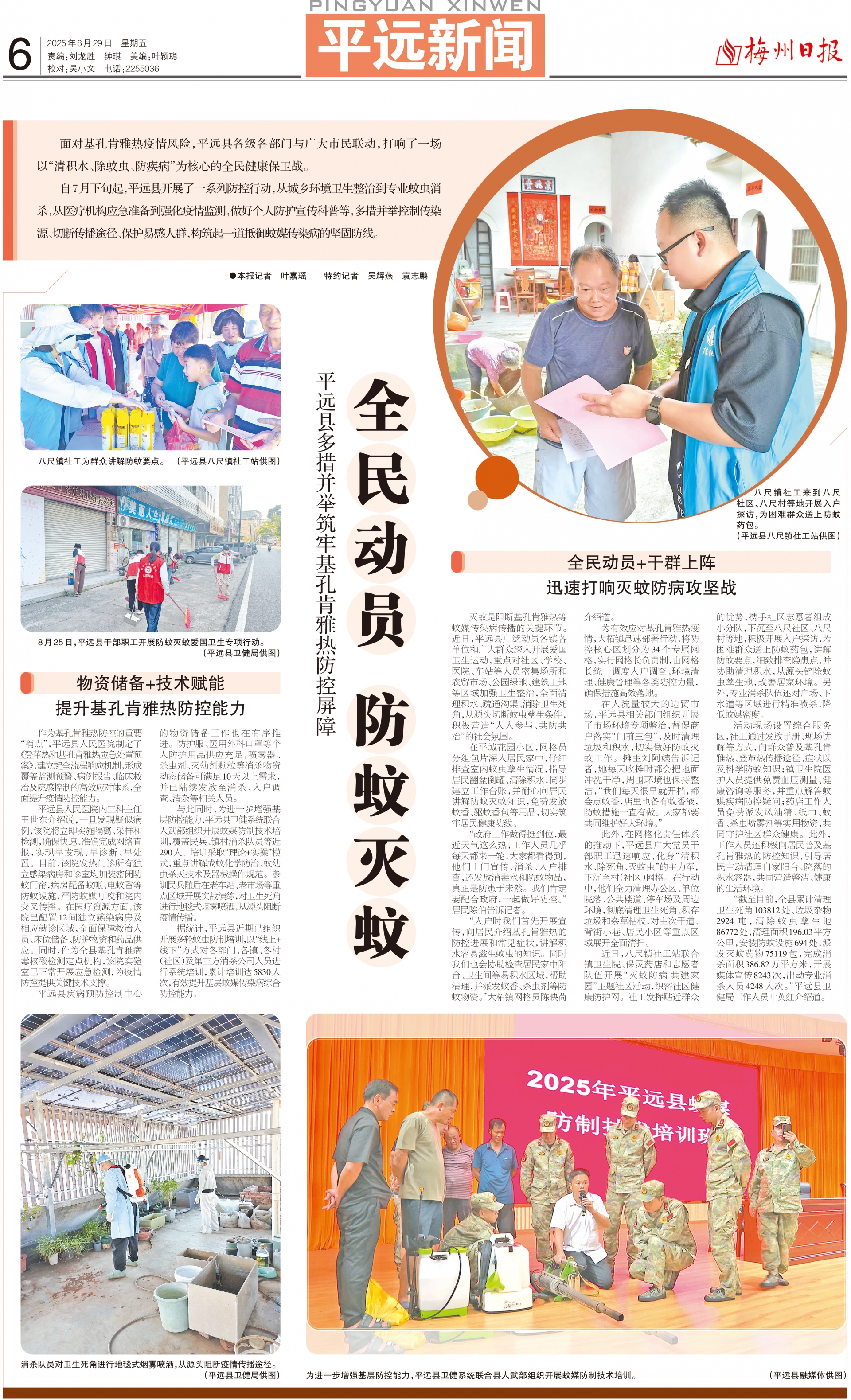 自7月下旬起,平远县开展了一系列防控行动,从城乡环境卫生整治到专业蚊虫消杀,从医疗机构应急准备到强化疫情监测,做好个人防护宣传科普等,多措并举控制传染源、切断传播途径、保护易感人群,构筑起一道抵御蚊媒传染病的坚固防线。