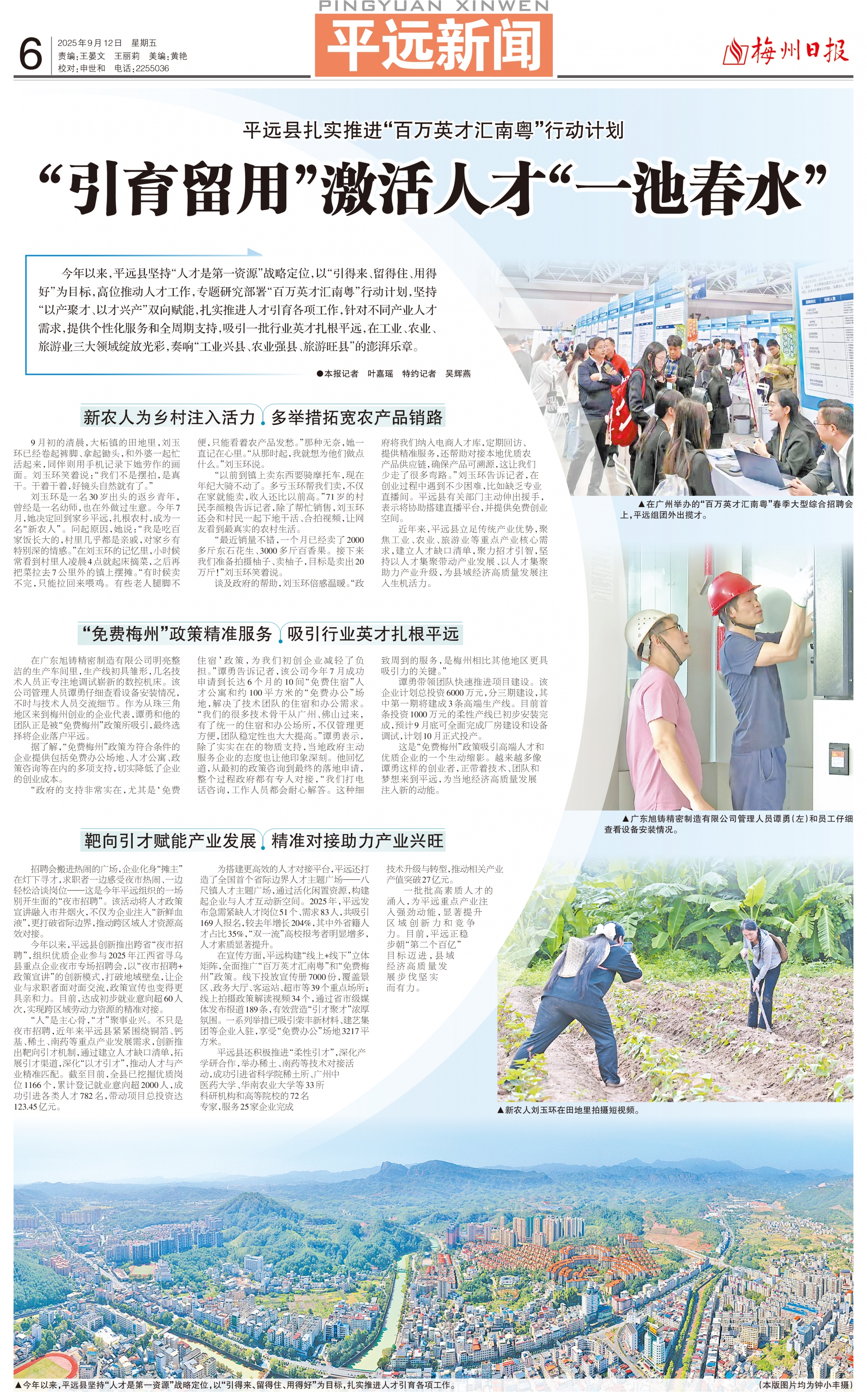 近年来,平远县立足传统产业优势,聚焦工业、农业、旅游业等重点产业核心需求,建立人才缺口清单,聚力招才引智,坚持以人才集聚带动产业发展、以人才集聚助力产业升级,为县域经济高质量发展注入生机活力。