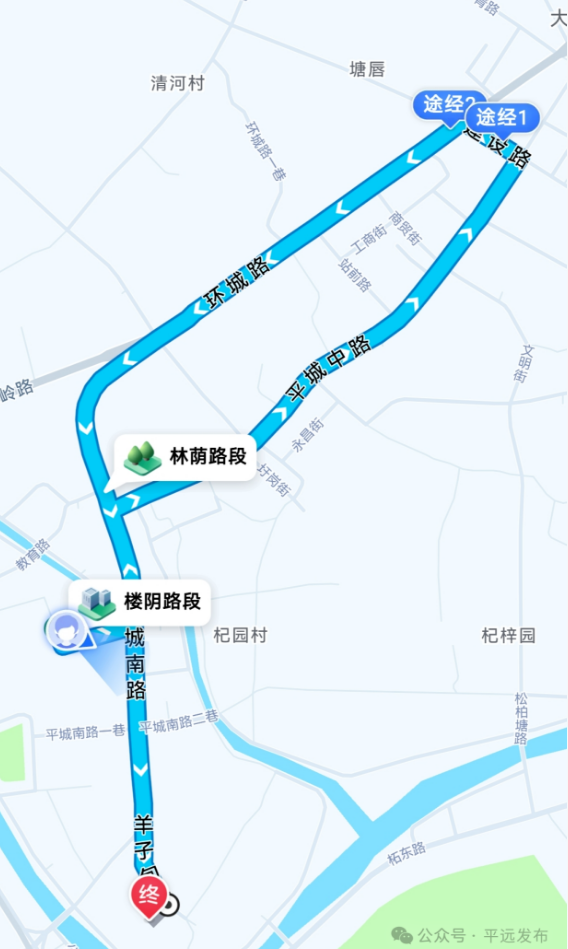 县人武部营区—平城南路—平城中路—建设路—环城路—平城南路—实验中学