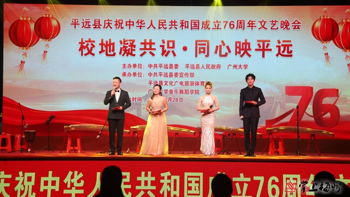 掌上梅州讯 9月28日晚,“校地凝共识 同心映平远”平远县庆祝中华人民共和国成立76周年文艺晚会在平远县人民广场举行,晚会以精彩纷呈的文艺节目,热情讴歌新中国76年的辉煌成就,生动展现广州大学与平远县校地合作的深厚情谊与丰硕成果。