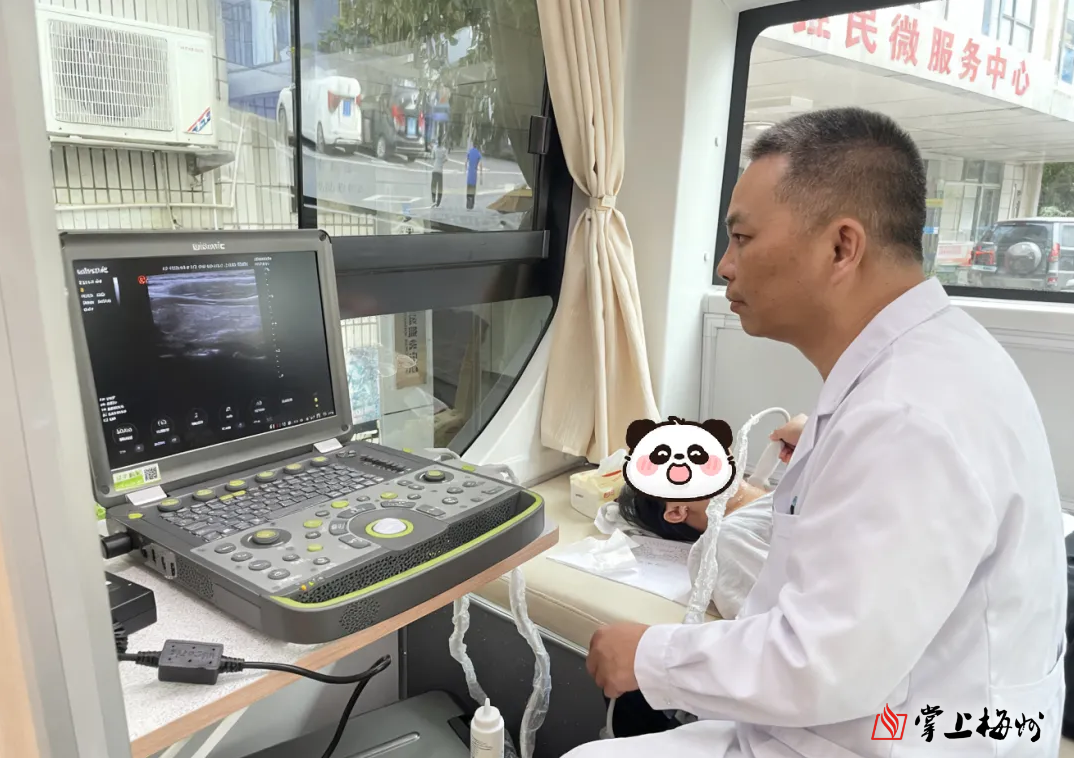 医用体检车内,医生正用设备为村民检查。(受访者供图)