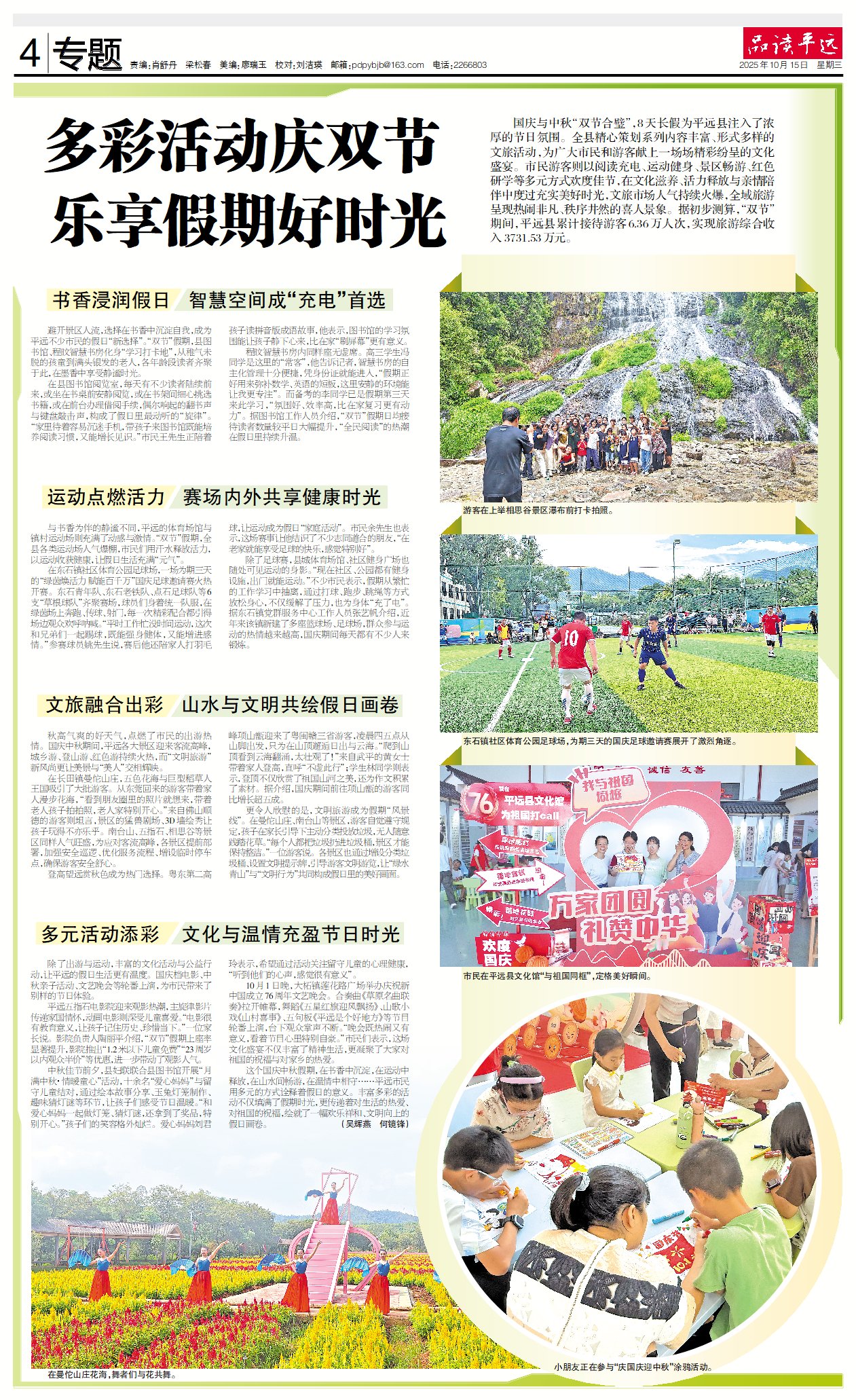 这个国庆中秋假期,在书香中沉淀,在运动中释放,在山水间畅游,在温情中相守……平远市民用多元的方式诠释着假日的意义。丰富多彩的活动不仅填满了假期时光,更传递着对生活的热爱、对祖国的祝福,绘就了一幅欢乐祥和、文明向上的假日画卷。
