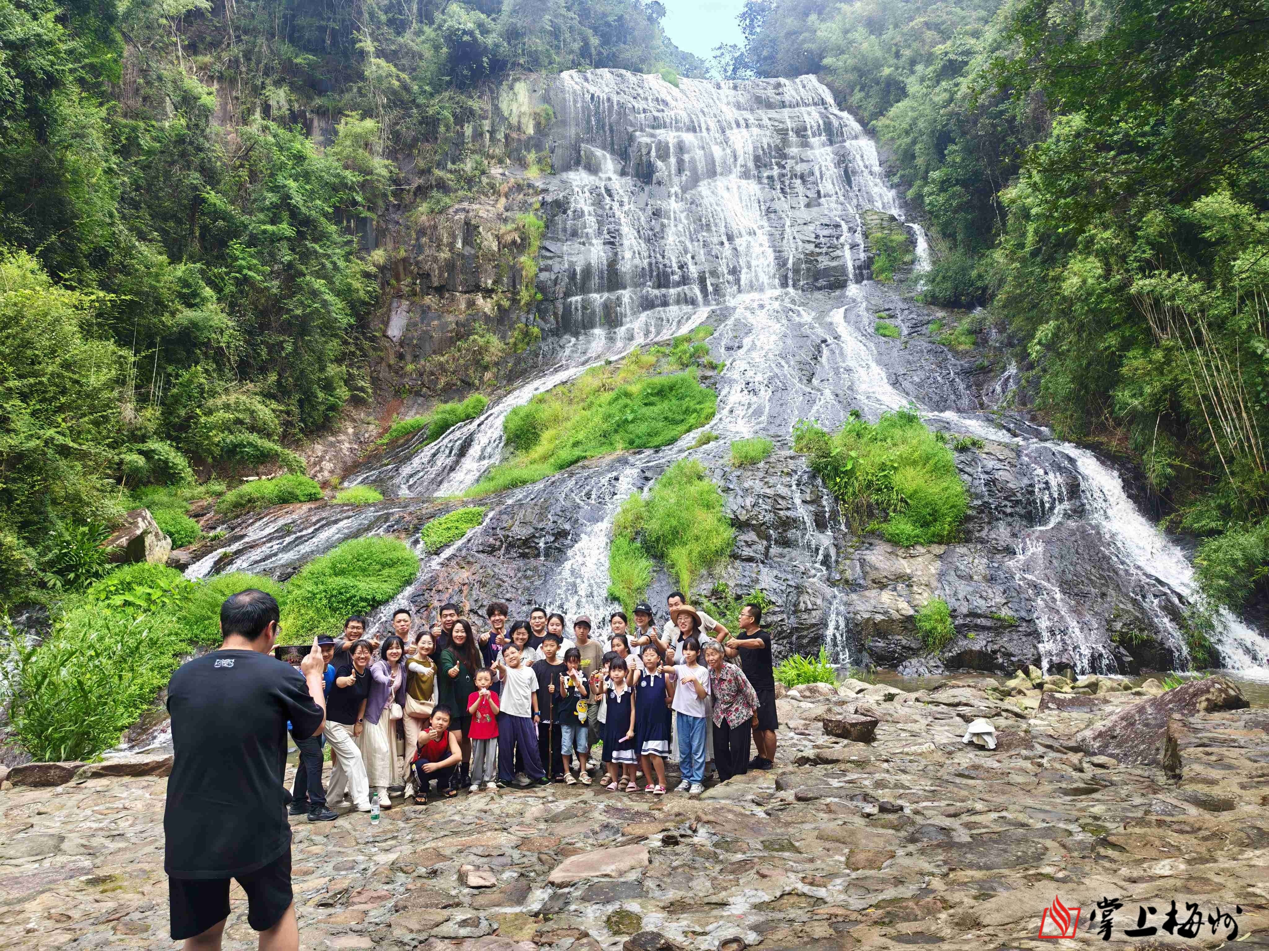 游客在上举相思谷景区瀑布前打卡拍照。