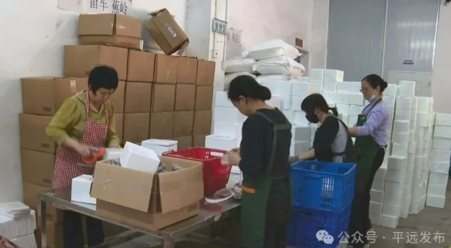 在梅州粤思念农业发展有限公司的农特产品仓库内,工作人员忙碌而有序地进行打包、发货,花生、娘酒、笋粄等农特产品正源源不断地发往全国各地。