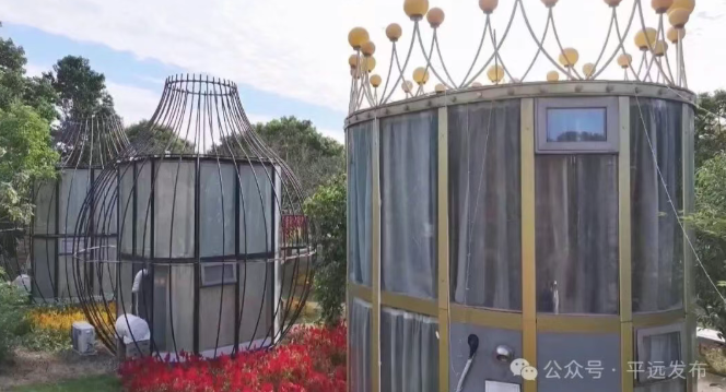 在该镇曼佗山庄景区,一栋栋造型新颖的太空舱错落排列,在阳光下熠熠生辉,与周围的花木相映成趣,构成一道独特的风景。