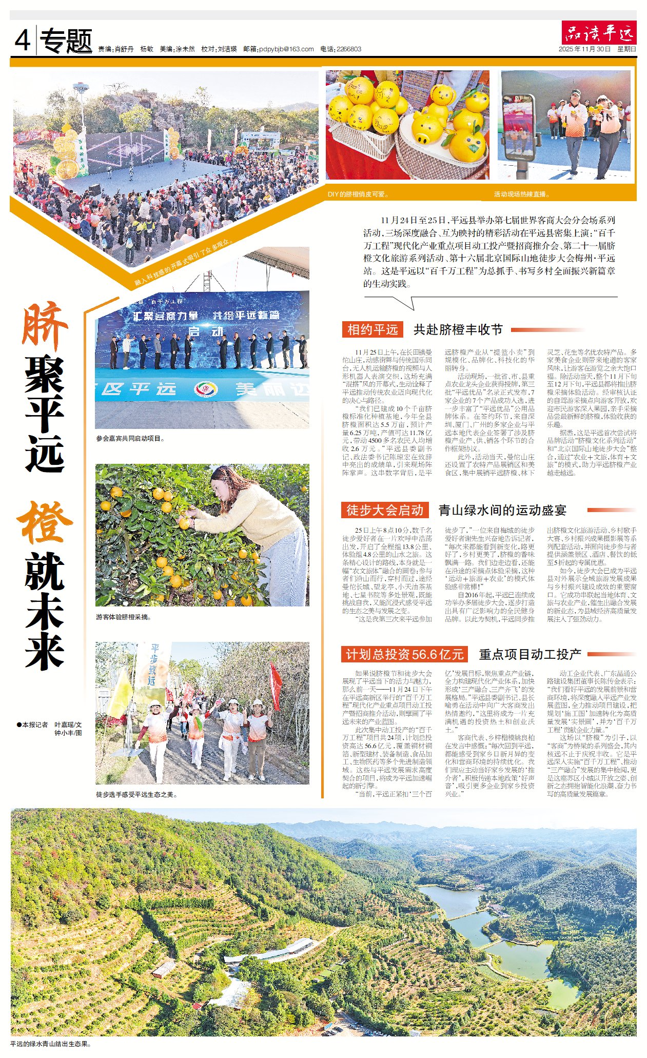 11月24日至25日,平远县举办第七届世界客商大会分会场系列活动,三场深度融合、互为映衬的精彩活动在平远县密集上演:“百千万工程”现代化产业重点项目动工投产暨招商推介会、第二十一届脐橙文化旅游系列活动、第十六届北京国际山地徒步大会梅州·平远站。这是平远以“百千万工程”为总抓手、书写乡村全面振兴新篇章的生动实践。