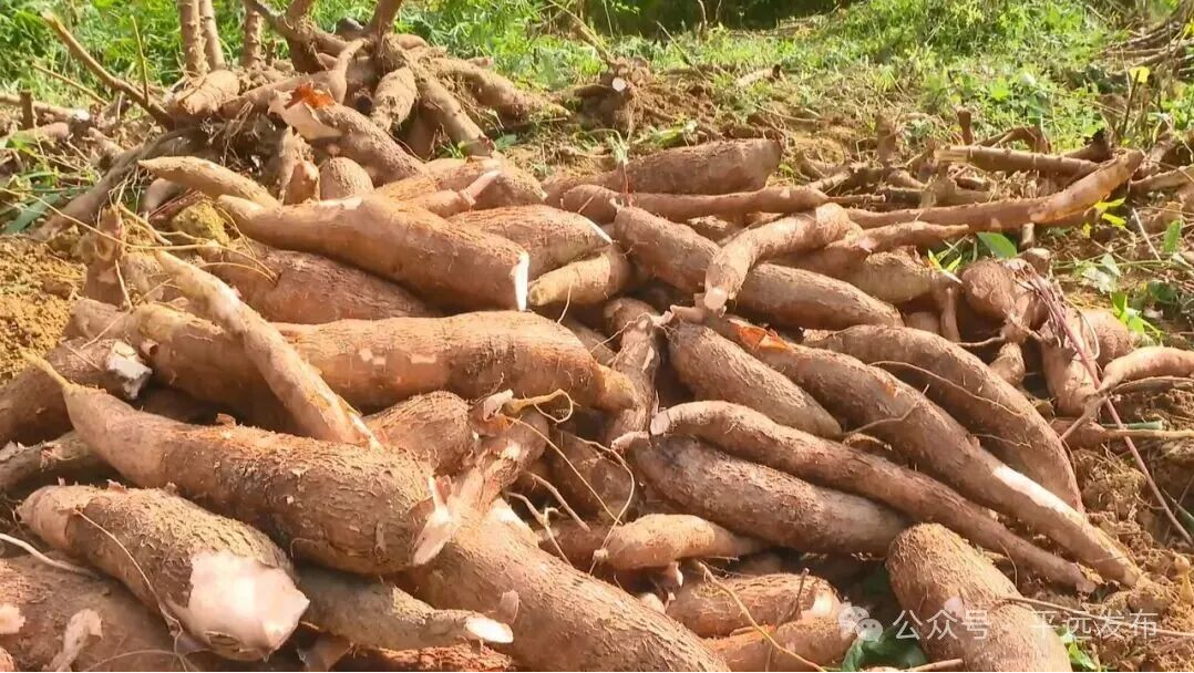 走进连片的木薯地,村民们正抢抓晴好天气挥锄采挖。一锄锄落下,一根根表皮棕黄、体型饱满的木薯破土而出,不一会儿就整整齐齐地堆满了田垄。