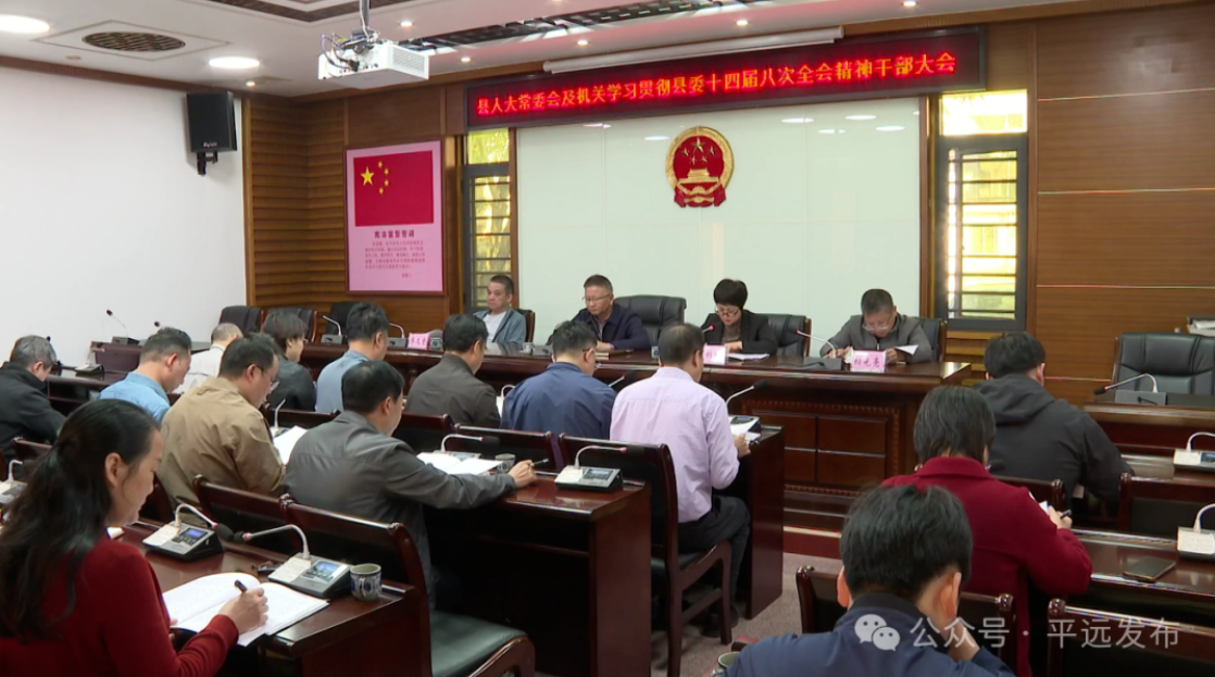 12月10日,平远县人大常委会党组书记、主任姚永波主持召开干部大会,传达学习省委十三届七次全会、市委八届十一次全会,深入贯彻落实县委十四届八次全会精神,动员县人大常委会及机关以高度的政治自觉、思想自觉和行动自觉,将全会确定的各项决策部署不折不扣地贯彻落实到依法履职的全过程、各方面,为奋力开创平远苏区加快振兴、高质量发展新局面贡献人大智慧和力量。肖桂华、廖文香、赖光亮等县人大常委会领导及县人大常委会机关全体干部职工出席会议。