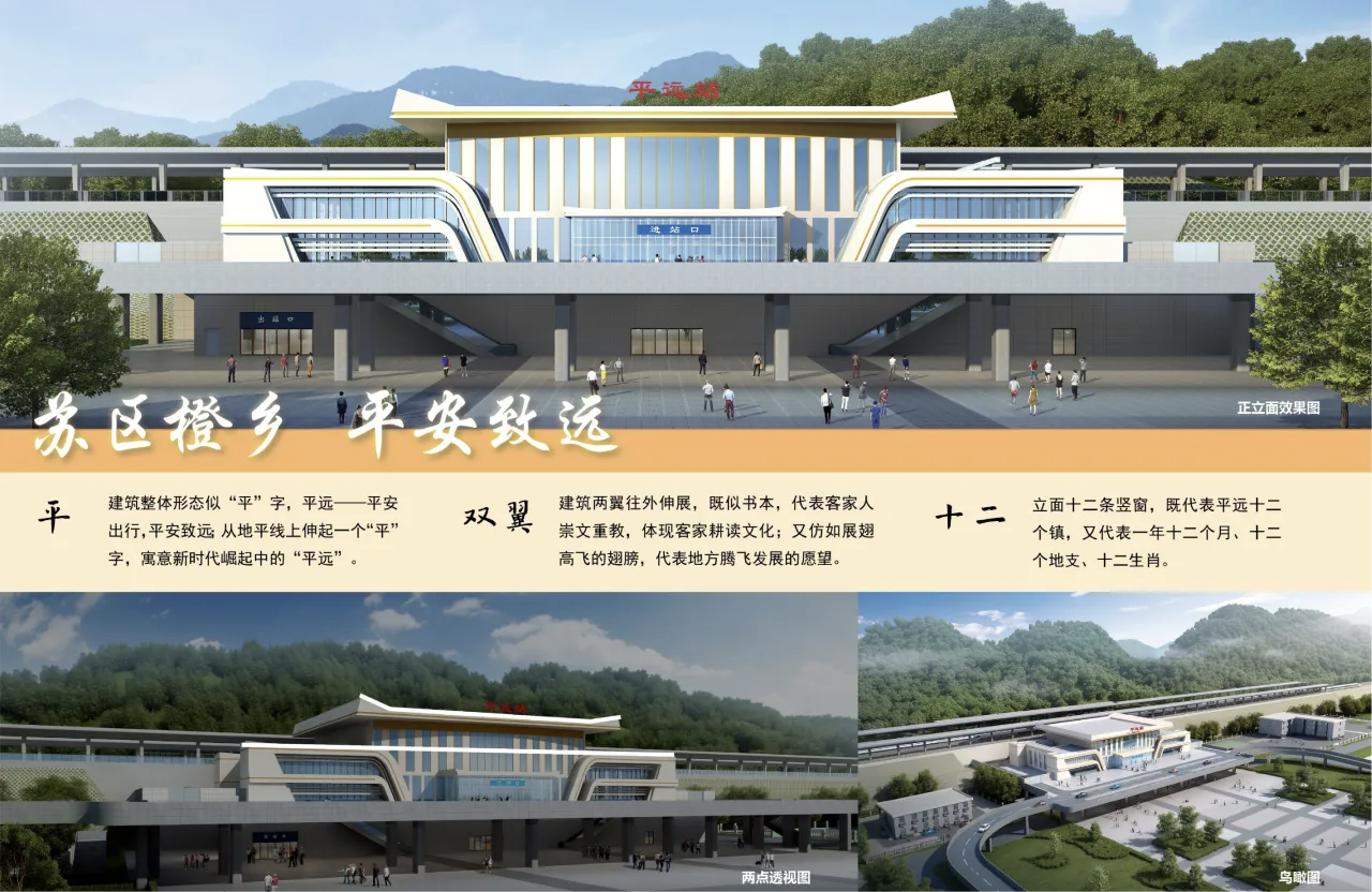 平远站站房形式为线侧下式,包含出站层、进站层、夹层。站场规模为2台4线,站房建筑面积3995平方米。平远站站房由中铁城建集团承建,站房设计融合“苏区橙乡、平安致远”的地域文化理念,致力打造成为展示地方形象的重要窗口。建成后将彻底结束平远县“无铁路、无火车站”的历史,同时有效改善粤闽赣边区交通格局,大幅缩短区域时空距离。