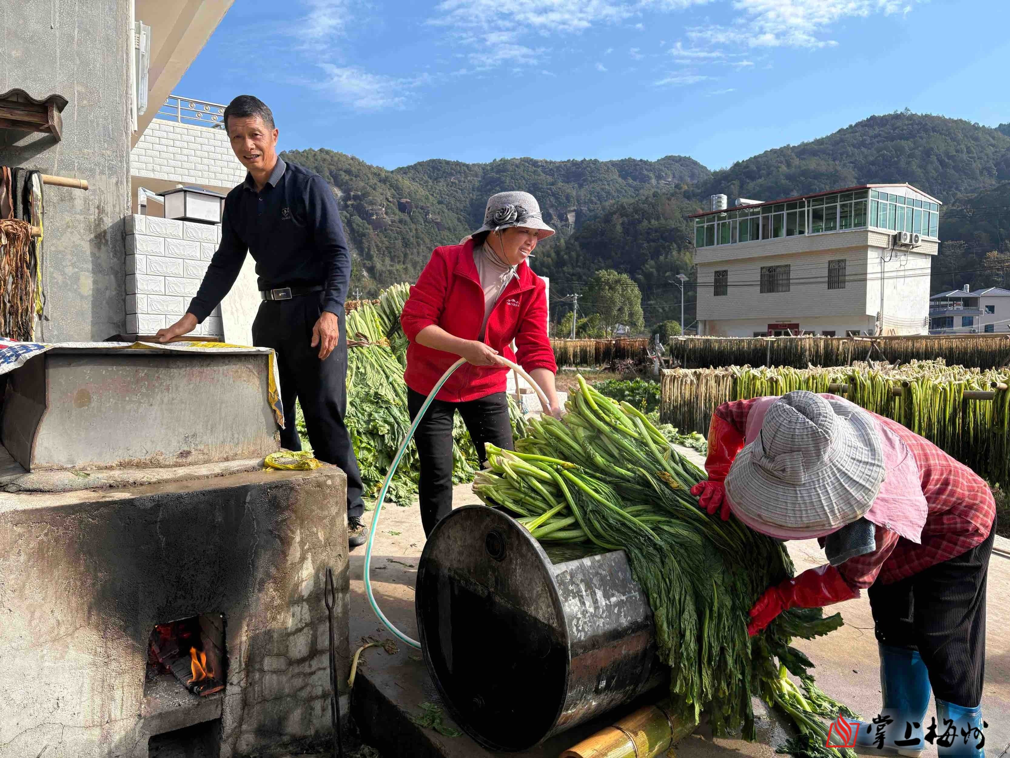 在村子另一头,村民谢清扬将成捆芥菜浸入滚水锅中。烫煮约十分钟,待菜叶变软,便细心捞起,挂上竹竿晾晒。“我种芥菜三十多年了,家里有两三亩地,今年亩产估计能超过450斤。”他笑着说,“天气好,菜也长得壮实,产量比去年高不少,算下来能有一万多元收益。”