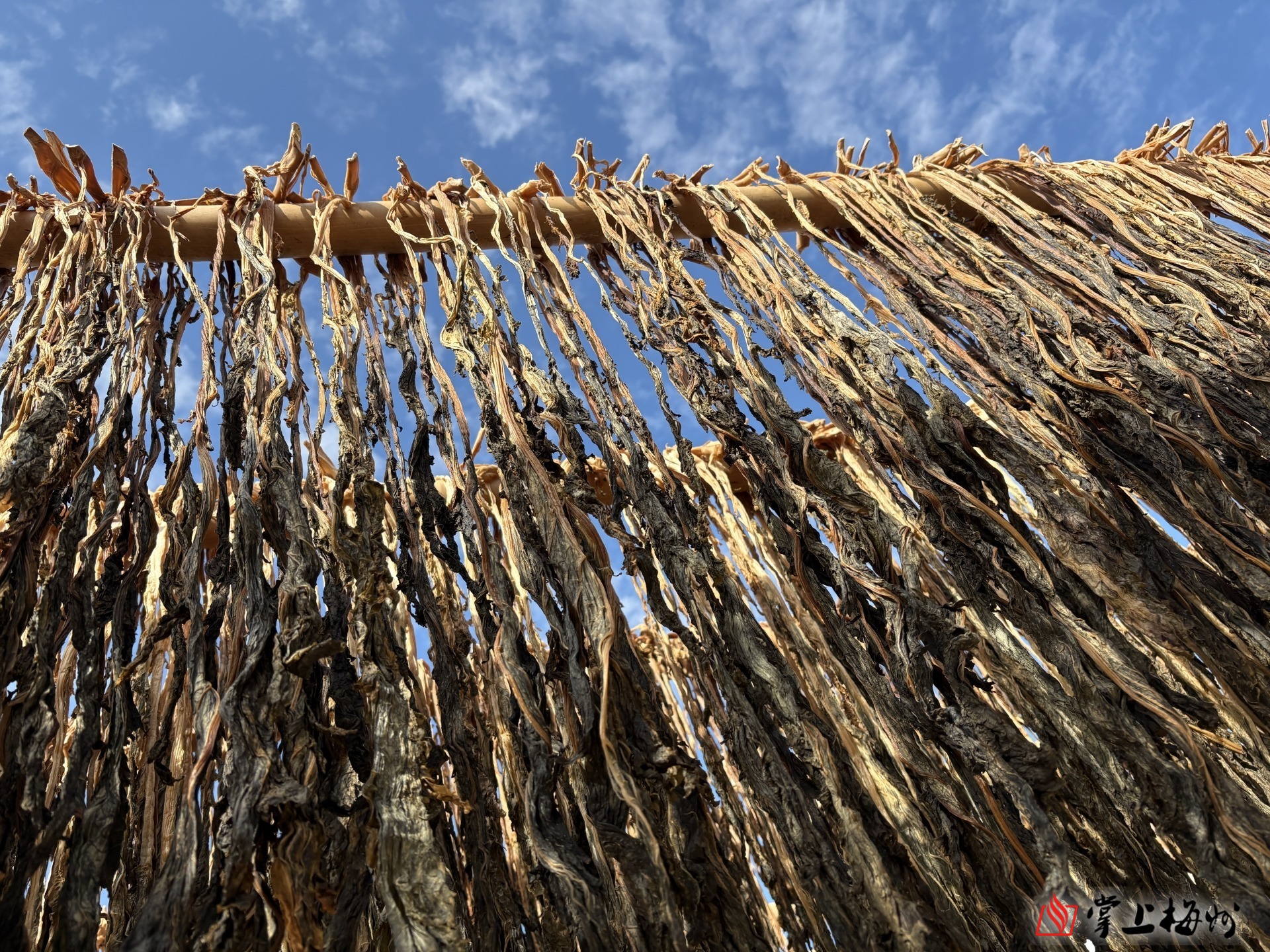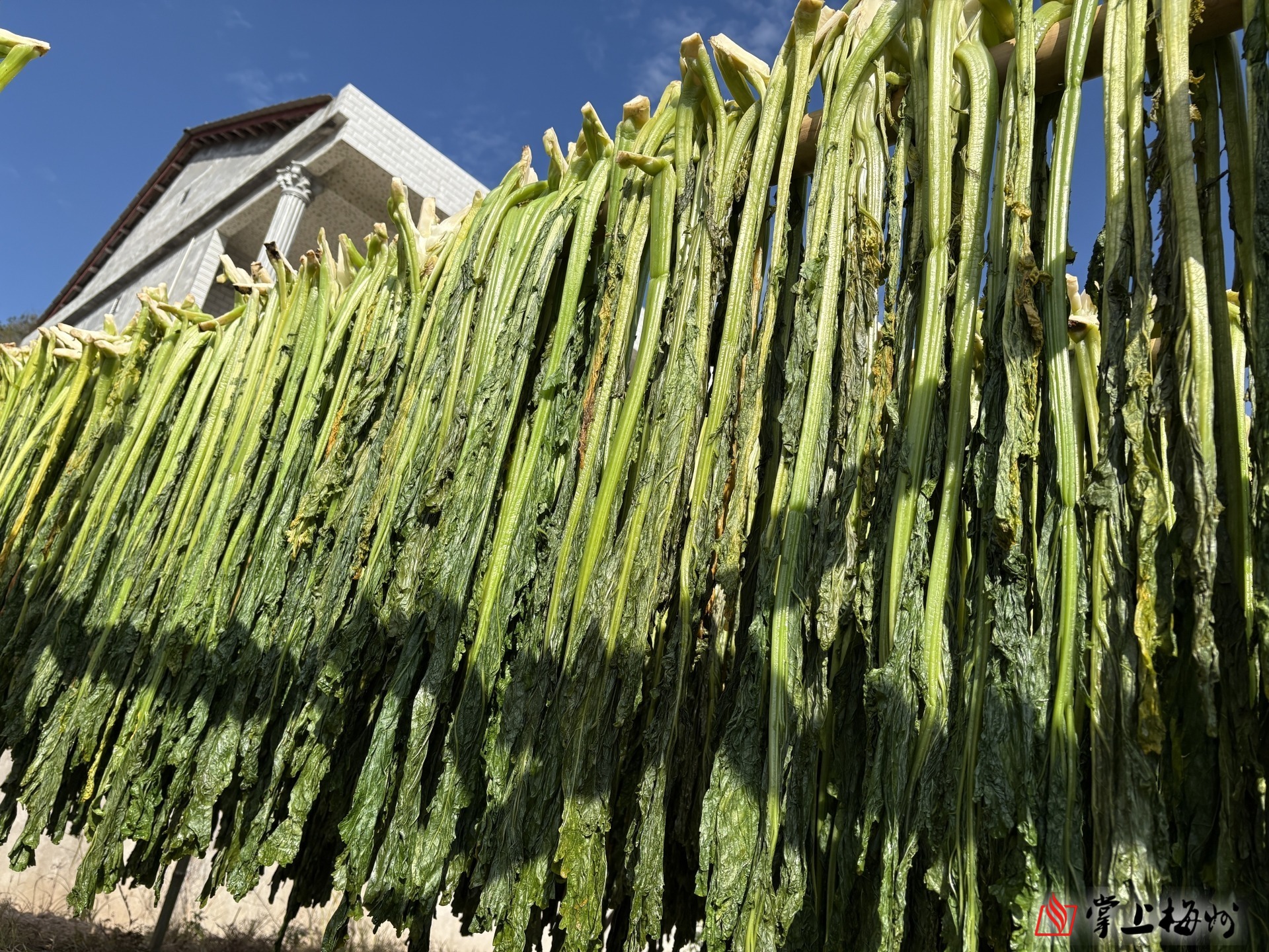 村民把煮软的芥菜拿到竹竿上进行晾晒,洋溢着丰收的喜悦。