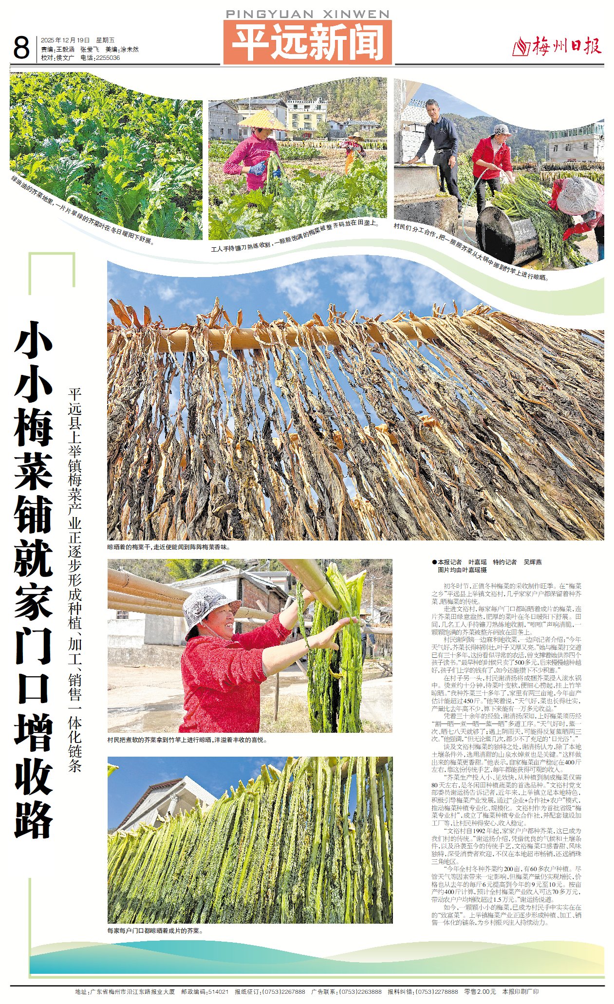 “芥菜生产投入小、见效快,从种植到制成梅菜仅需80天左右,是冬闲田种植蔬菜的首选品种。”文裕村党支部委员谢运扬告诉记者,近年来,上举镇立足本地特色,积极引导梅菜产业发展,通过“企业+合作社+农户”模式,推动梅菜种植专业化、规模化。文裕村作为首批省级“梅菜专业村”,成立了梅菜种植专业合作社,并配套建设加工厂等,让村民种得安心、收入稳定。