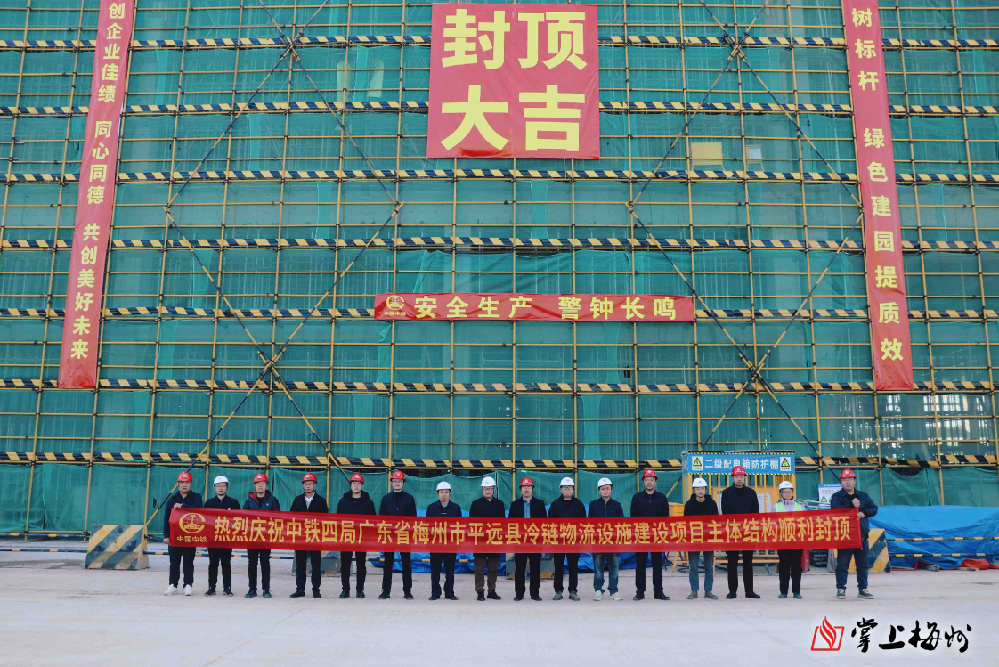 掌上梅州讯 1月10日上午,随着最后一块顶板混凝土浇筑完成,由中铁四局承建的广东省梅州市平远县冷链物流设施建设项目1#冷库大楼较原计划提前2个月完成封顶,这标志着该项目建设取得了关键性的阶段性成果。