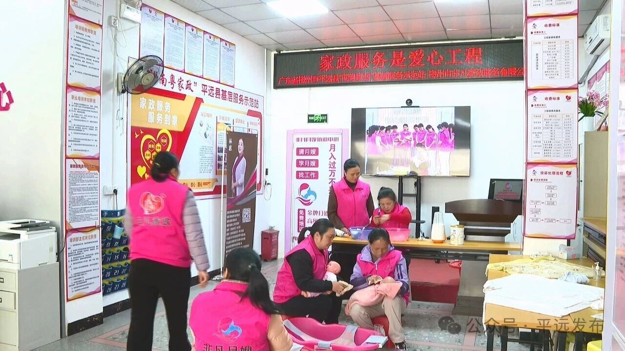 在平远县非凡月嫂培训中心,学员们正在进行母婴护理实操训练。从新生儿洗澡、脐带护理到产后康复指导,标准化的技能培训让家政服务更专业、更规范。