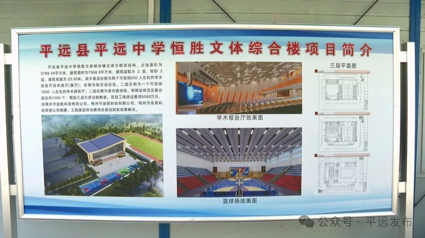 据悉,平远中学恒胜文体综合楼项目工程建设费用5088万元,由曹恒胜先生及其所属公司捐赠。项目主体为框架结构,占地面积为3769.34平方米,建筑面积为7958.9平方米,建筑层数为2层,局部3层,建筑高度为23.95米。其中首层左侧为两个可容纳250人左右的学术报告厅及休息厅(展厅);右侧为架空运动区。二层左侧为一个可容纳1200人左右的学术报告厅;二层右侧为室内篮球场,两侧设有固定看台座位约1000个;局部三层为多功能教室。