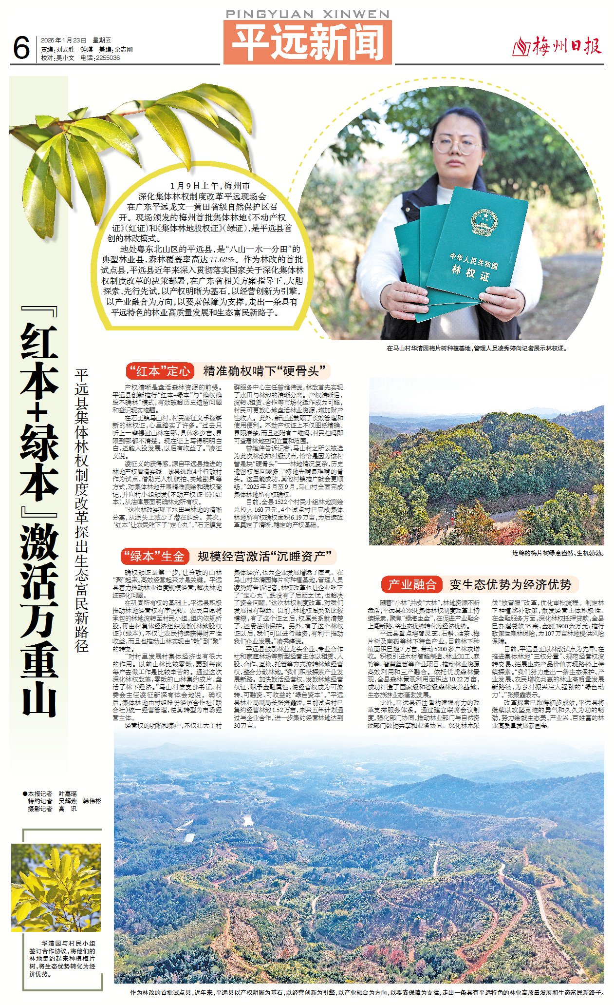 1月9日上午,梅州市深化集体林权制度改革平远现场会在广东平远龙文—黄田省级自然保护区召开。现场颁发的梅州首批集体林地《不动产权证》(红证)和《集体林地股权证》(绿证),是平远县首创的林改模式。