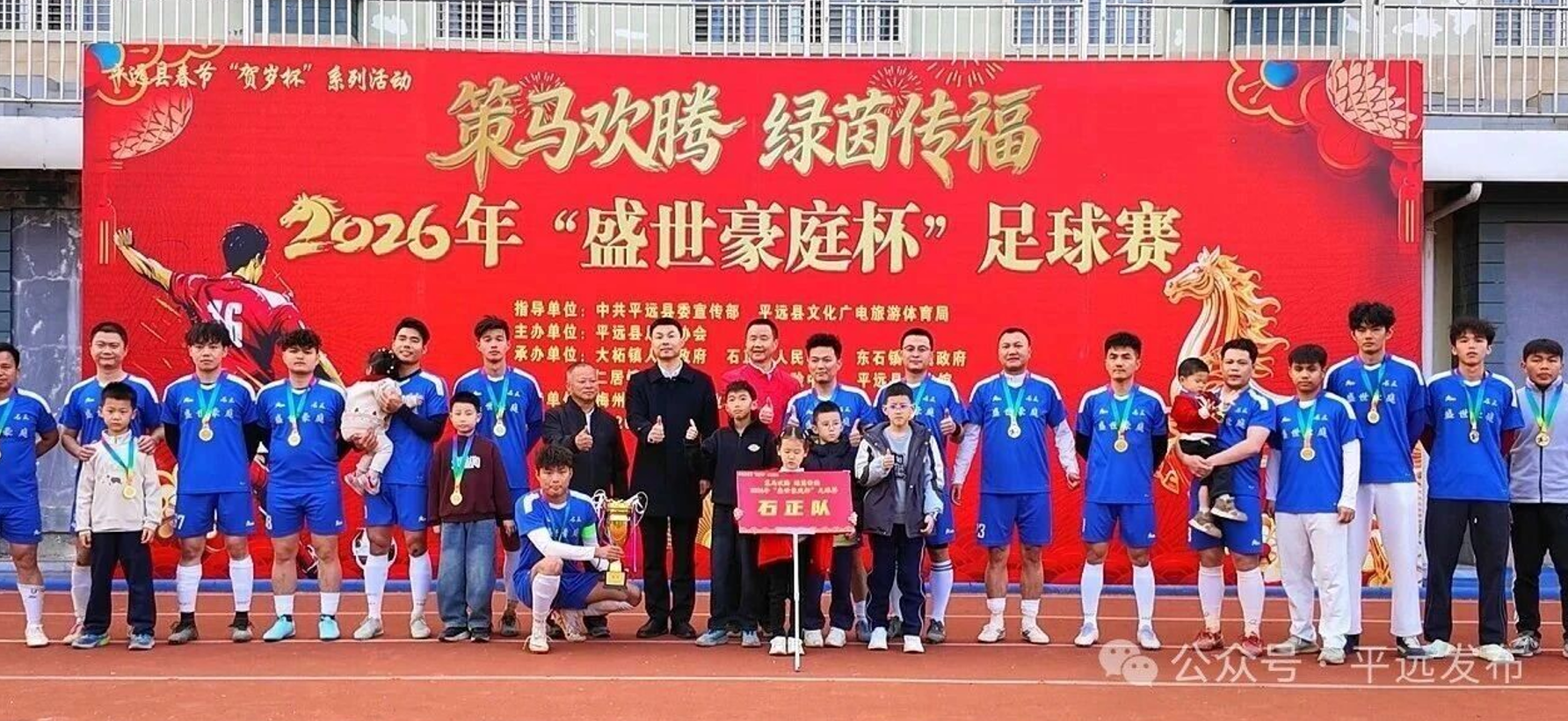 据悉,本届赛事由平远县委宣传部、县文化广电旅游体育局指导,县足球协会主办,并得到梅州市新京盛实业有限公司的大力支持。比赛自2月8日开赛以来,东石、大柘、石正、仁居等四支乡镇代表队轮番登场,展开激烈比拼,最终决出各项荣誉。本次赛事不仅为全县足球爱好者搭建了高水平的竞技交流平台,更创新融合农产品展销、文旅推介与有奖互动等元素,充分释放“文化+体育+消费”的多重效应,为新春佳节献上了一份充满激情与年味的体育贺礼。