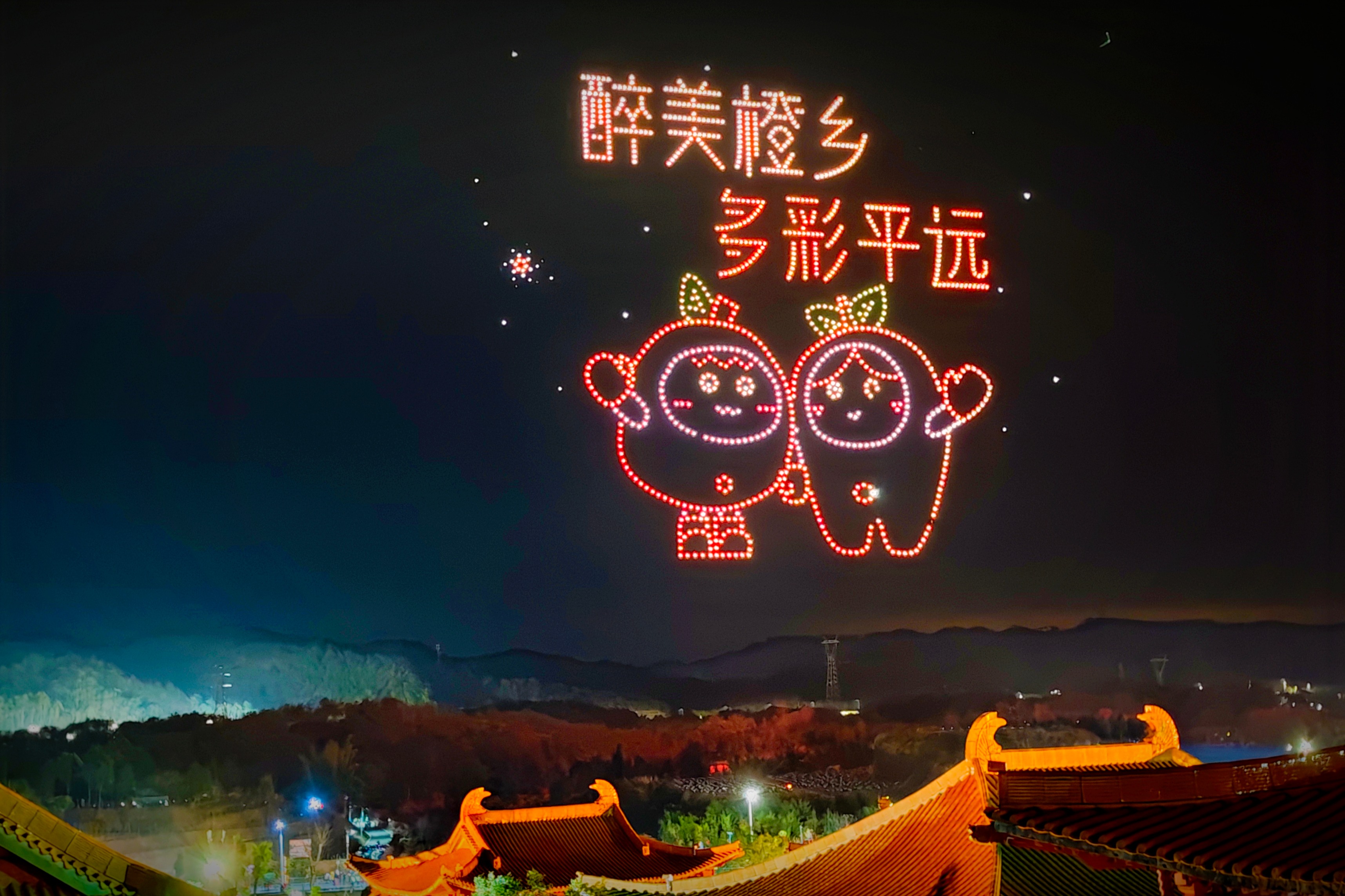 夜幕降临,无人机方阵缓缓升空,灯光次第点亮,瞬间将夜空织成璀璨星河。开篇画面里,一对憨态可掬的橙子形象跃然天际,搭配“平远欢迎你”的温暖字样,瞬间拉近了与观众的距离。