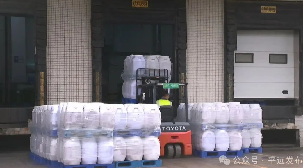 与此同时,广东天柘冷链物流基地的冷链二期项目也进入收尾阶段。新建冷库内空间开阔,照明、冷冻、排水等设施设备一应俱全。一旁的一期冷库门口,大货车正停在冷库前,工人们用叉车忙碌地搬运冷链货物。