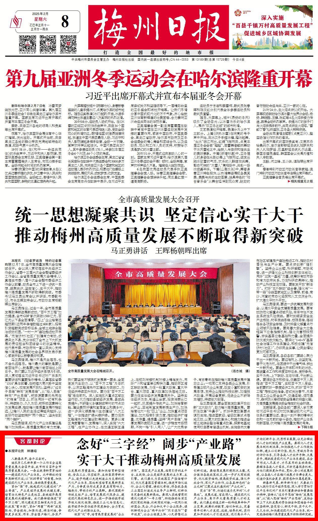 新春新气象、新年新作为!只要我们深入践行习近平经济思想,深入学习贯彻习近平总书记对广东系列重要讲话和重要指示精神,坚持从“过日子思维”转向“发展思维”,从“投入思维”转向“产出思维”,发扬全市上下大抓发展的责任担当和团结奋斗的攻坚精神,坚定信心、铆足干劲,实干大干、久久为功,加快建设现代化产业体系,就一定能推动梅州高质量发展不断取得新突破。