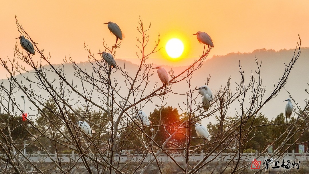 白鹭“挂满枝头”,给落日时分的蕉岭增添了一抹灵动的风采。