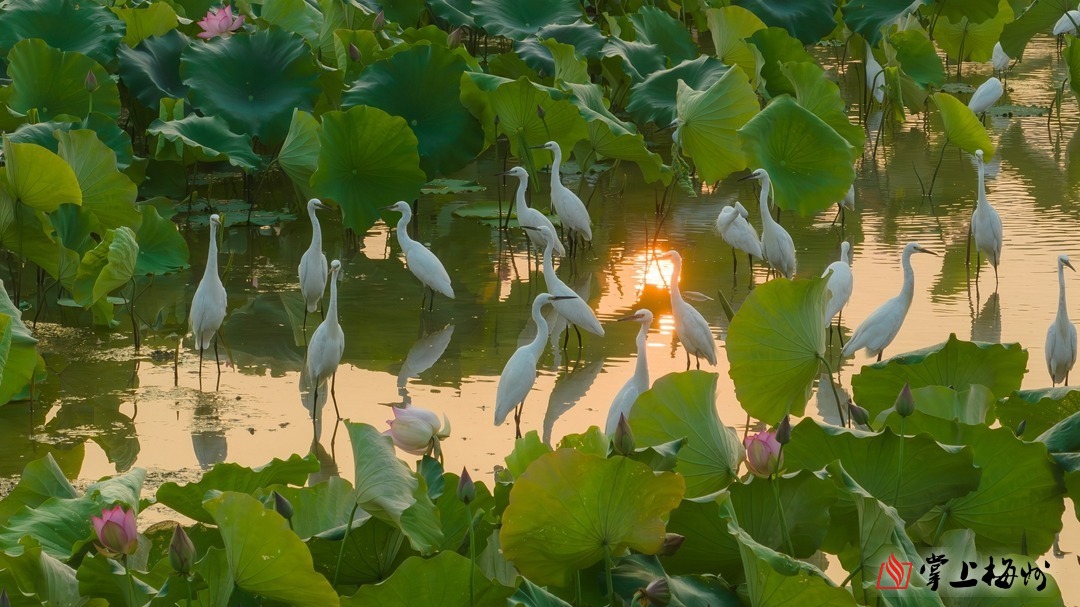 荷间白鹭伴余晖,彰显生态优先发展理念之美。