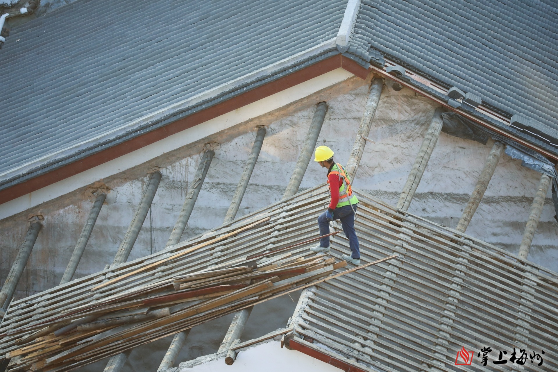 嘉应古城历史文化街区保护提升项目,工人在屋顶工作。