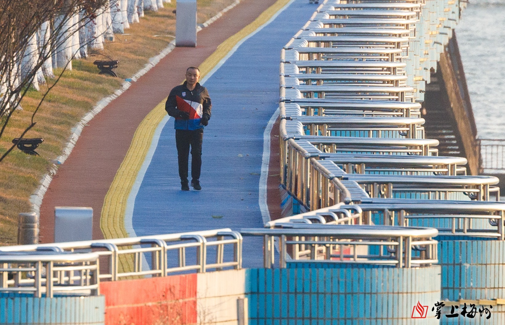 梅城市民沿江奔跑,夕阳下整齐的护栏闪耀着金属光泽。
