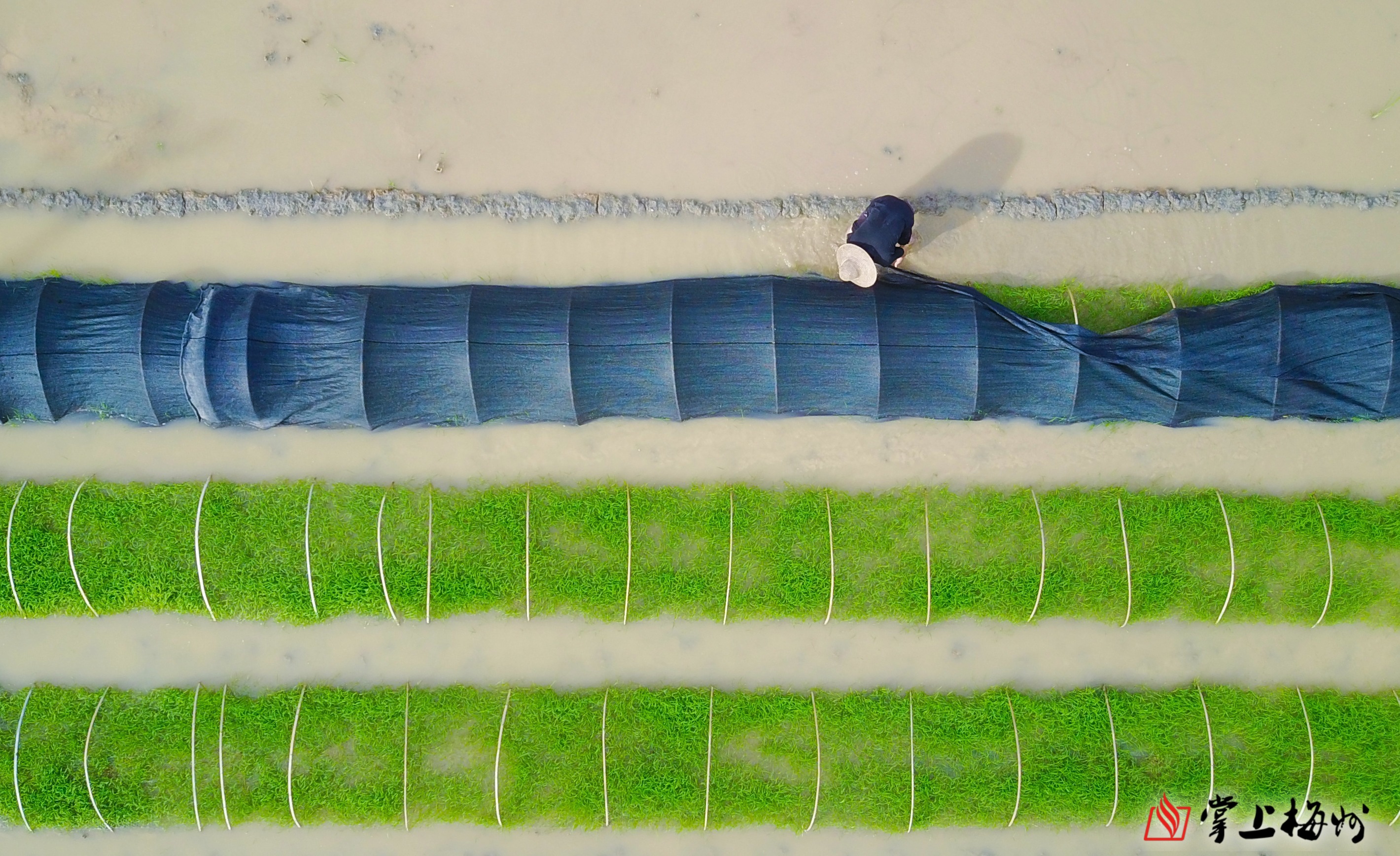 秧苗在大地上织出一张绿网,农人俯身将一丛丛新绿细细梳理。