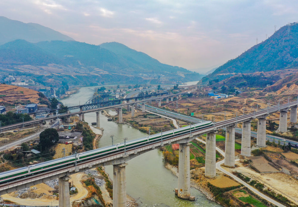 一列复兴号动车组在四川省冕宁县境内的新成昆铁路进行开通运营前的试跑,远处是老成昆铁路(无人机照片,2022年12月24日摄)。新华社记者 王曦 摄