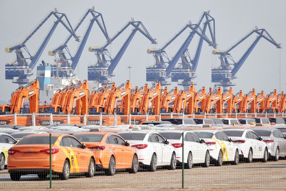 在江苏连云港港口码头,一批国产小汽车在等待装船出口海外(无人机照片,1月13日摄)。新华社发(耿玉和 摄)
