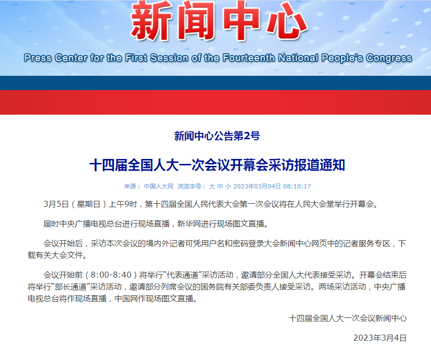 3月5日(星期日)上午9时,第十四届全国人民代表大会第一次会议将在人民大会堂举行开幕会。