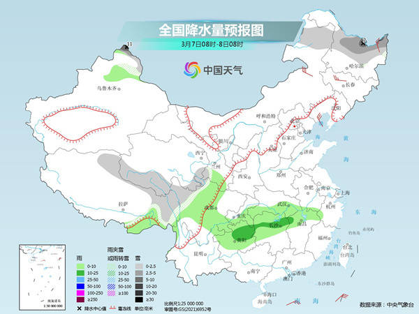 中央气象台预计,今天,新疆西北部、西藏北部和东部、青海南部、川西高原等地部分地区有小到中雪或雨夹雪,其中,新疆西北部等地部分地区有大雪(5~7毫米);新疆西北部、西藏东南部、四川南部、重庆、贵州、云南东部、湖南西北部、湖北西南部等地部分地区有小到中雨,其中,西藏东南部局地有大雨(25~30毫米)。