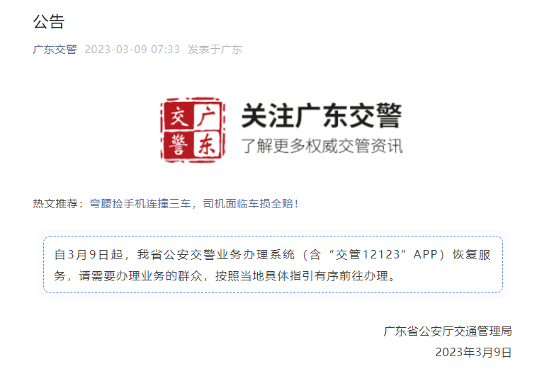周知!广东交警业务办理系统恢复服务 2023-03-09 08:25 广东交警 2 广东交警微信公众号今日发布公告,自3月9日起,广东省公安交警业务办理系统(含“交管12123”APP)恢复服务,请需要办理业务的群众,按照当地具体指引有序前往办理。 编辑:杨乔颖 梁诗婷(实习) 审核:蔡颜颜