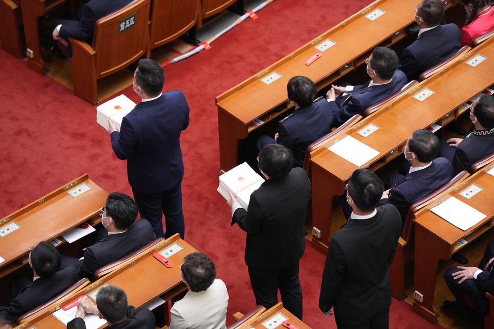 3月10日,十四届全国人大一次会议在北京人民大会堂举行第三次全体会议。这是工作人员发放选票。新华社记者 李鑫 摄
