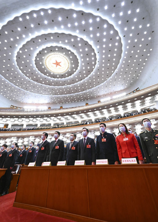 3月13日,第十四届全国人民代表大会第一次会议在北京人民大会堂举行闭幕会。这是代表们高唱国歌。新华社记者 刘金海 摄