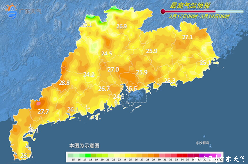 17日,韶关、清远和河源北部多云到阴天,有分散小雨,其余市县多云间阴天局部零星小雨。最低气温:河源、梅州和粤东市县14℃~17℃,粤西和珠江口附近市县20℃~22℃,其余市县17℃~20℃。