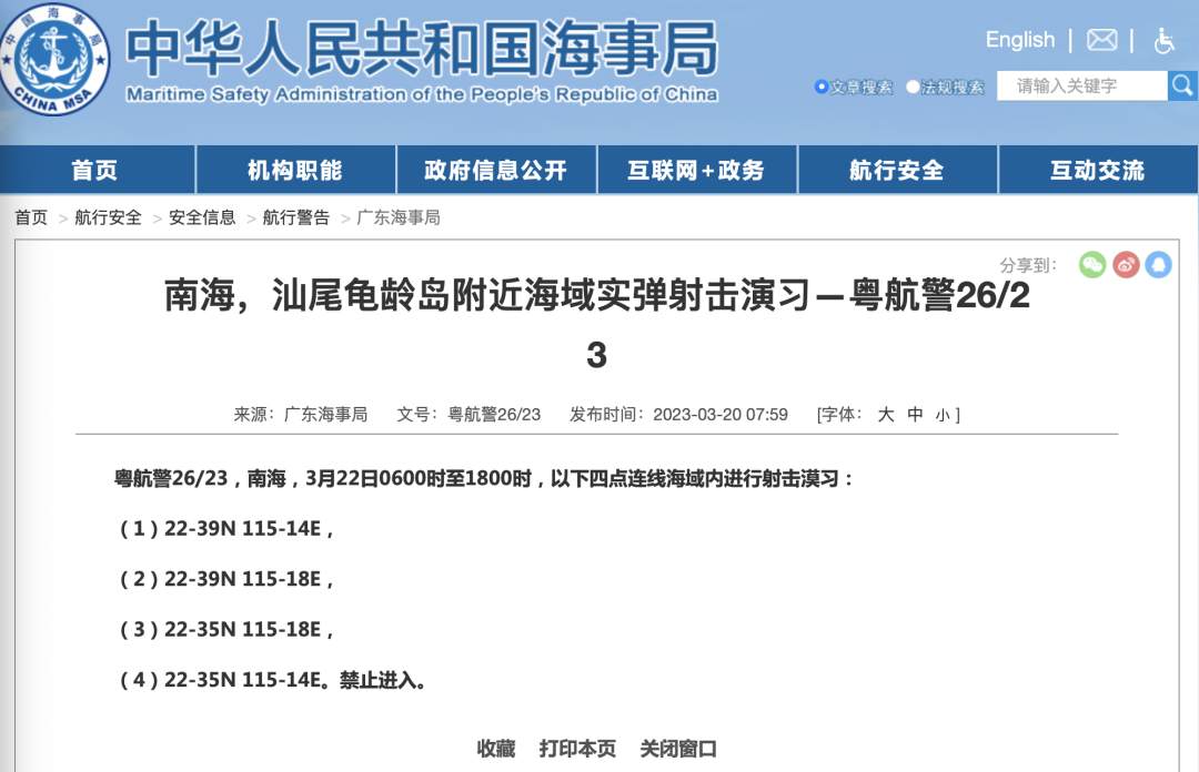 广东海事局发布航行警告,3月22日6时至18时,南海汕尾龟龄岛附近海域实弹射击演习,禁止进入。