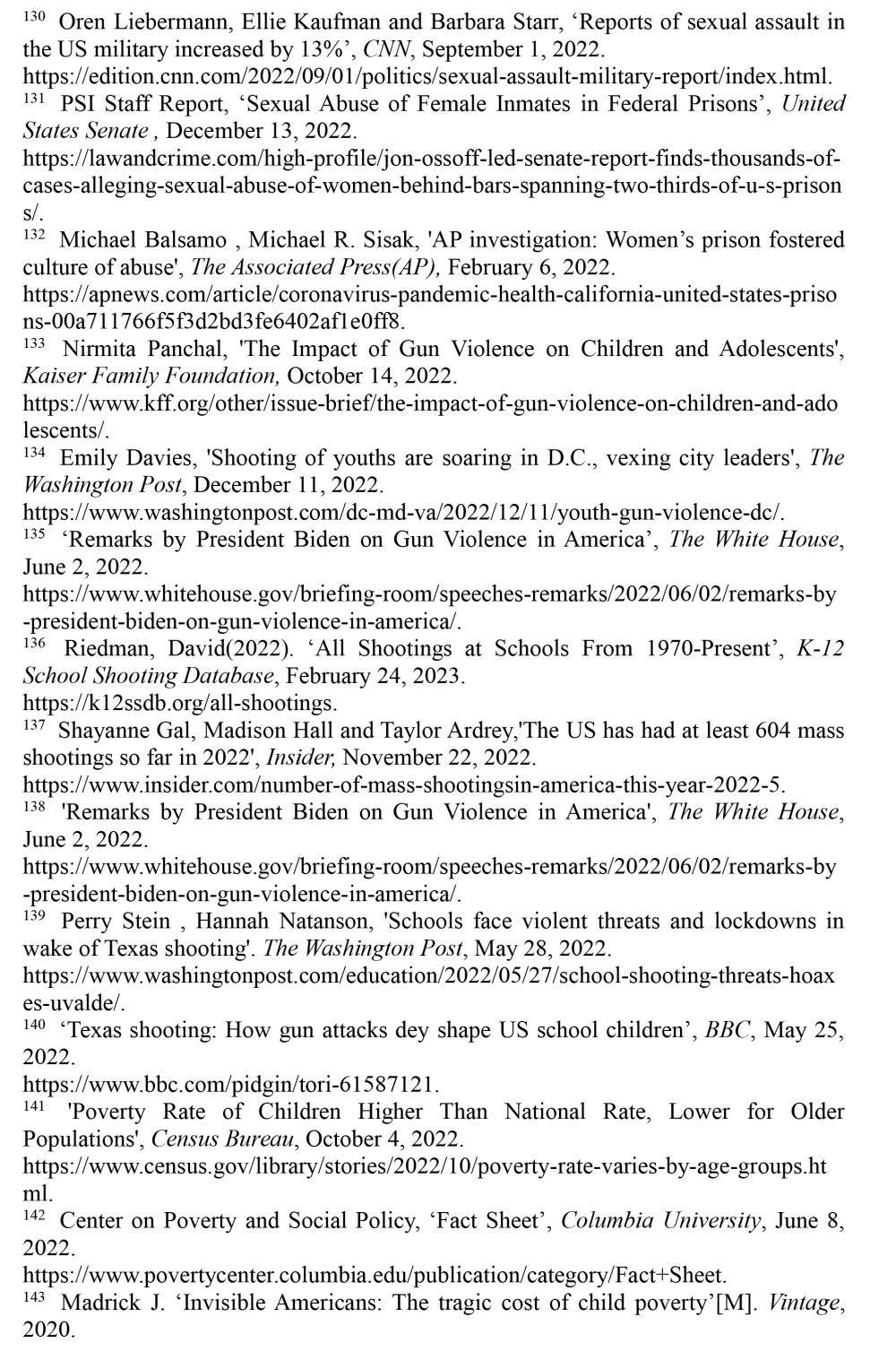 妇女堕胎失去宪法保护,儿童生存环境令人担忧。美国联邦最高法院推翻“罗伊诉韦德案”的裁决终结了近50年来受宪法保护的堕胎权,是对妇女人权和性别平等的巨大打击。2022年美国有超过5800名18岁以下的儿童因枪击受伤或死亡,校园枪击事件数量高达302起,创1970年以来的最高值。美国儿童贫困率从2021年12月的12.1%上升至2022年5月的16.6%,增加了330万贫困儿童。2018年以来被非法雇用的童工激增近70%,2022财年受雇专门从事危险工作的儿童增加了26%。